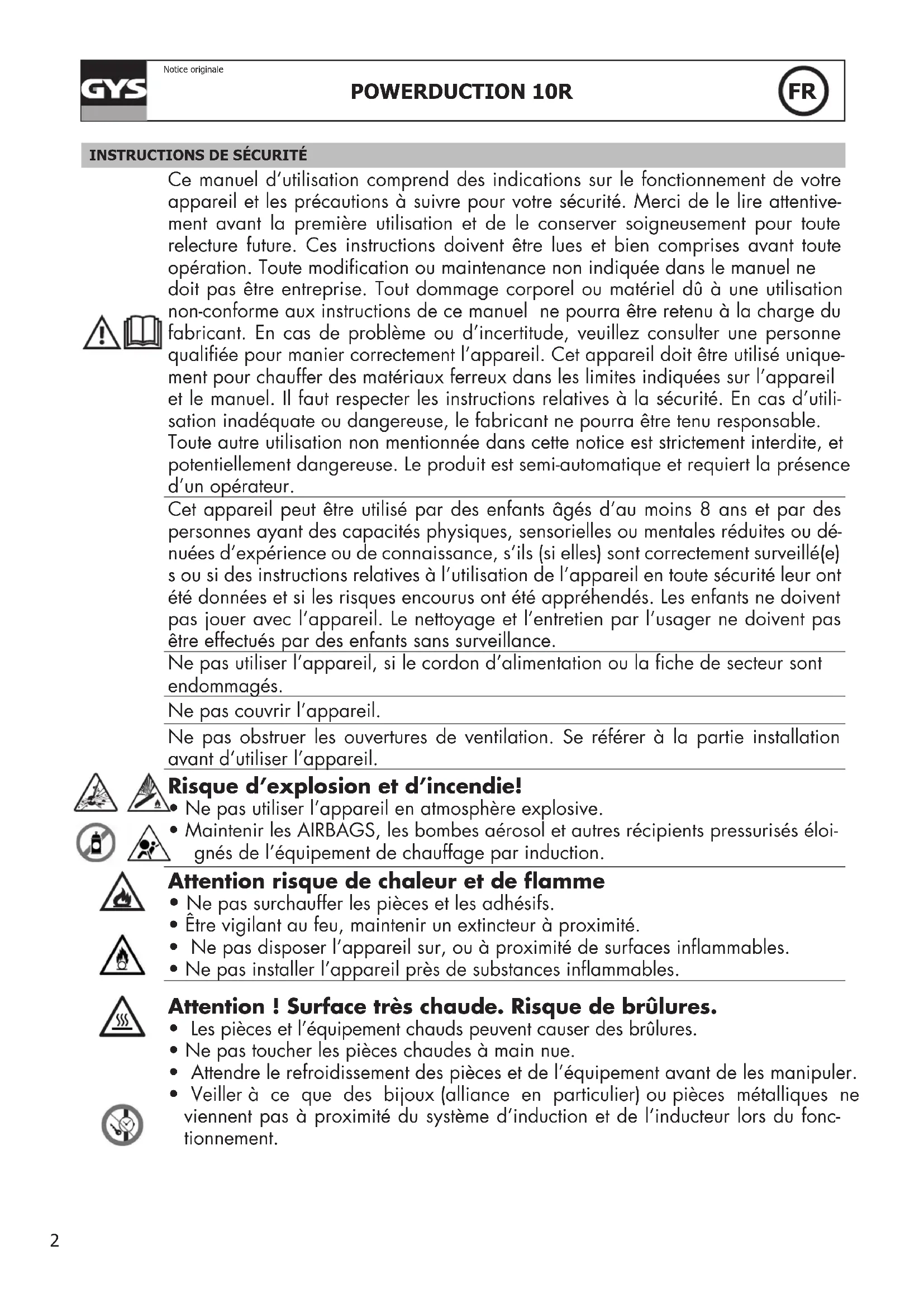 Ce manuel d’utilisation comprend des indications sur le fonctionnement de votre appareil et les précautions à suivre pour votre sécurité. Merci de le lire attentive- ment avant la première utilisation et de le conserver soigneusement pour toute relecture future. Ces instructions doivent être lues et bien comprises avant toute opération. Toute modication ou maintenance non indiquée dans le manuel ne doit pas être entreprise. Tout dommage corporel ou matériel dû à une utilisation non-conforme aux instructions de ce manuel ne pourra être retenu à la charge du fabricant. En cas de problème ou d’incertitude, veuillez consulter une personne qualiée pour manier correctement l’appareil. Cet appareil doit être utilisé unique- ment pour chauffer des matériaux ferreux dans les limites indiquées sur l’appareil et le manuel. Il faut respecter les instructions relatives à la sécurité. En cas d’utili- sation inadéquate ou dangereuse, le fabricant ne pourra être tenu responsable. Toute autre utilisation non mentionnée dans cette notice est strictement interdite, et potentiellement dangereuse. Le produit est semi-automatique et requiert la présence d’un opérateur. Cet appareil peut être utilisé par des enfants âgés d’au moins 8 ans et par des personnes ayant des capacités physiques, sensorielles ou mentales réduites ou dé- nuées d’expérience ou de connaissance, s’ils (si elles) sont correctement surveillé(e) s ou si des instructions relatives à l’utilisation de l’appareil en toute sécurité leur ont été données et si les risques encourus ont été appréhendés. Les enfants ne doivent pas jouer avec l’appareil. Le nettoyage et l’entretien par l’usager ne doivent pas être effectués par des enfants sans surveillance. Ne pas utiliser l’appareil, si le cordon d’alimentation ou la che de secteur sont endommagés. Ne pas couvrir l’appareil. Ne pas obstruer les ouvertures de ventilation. Se référer à la partie installation avant d’utiliser l’appareil. Risque d’explosion et d’incendie!