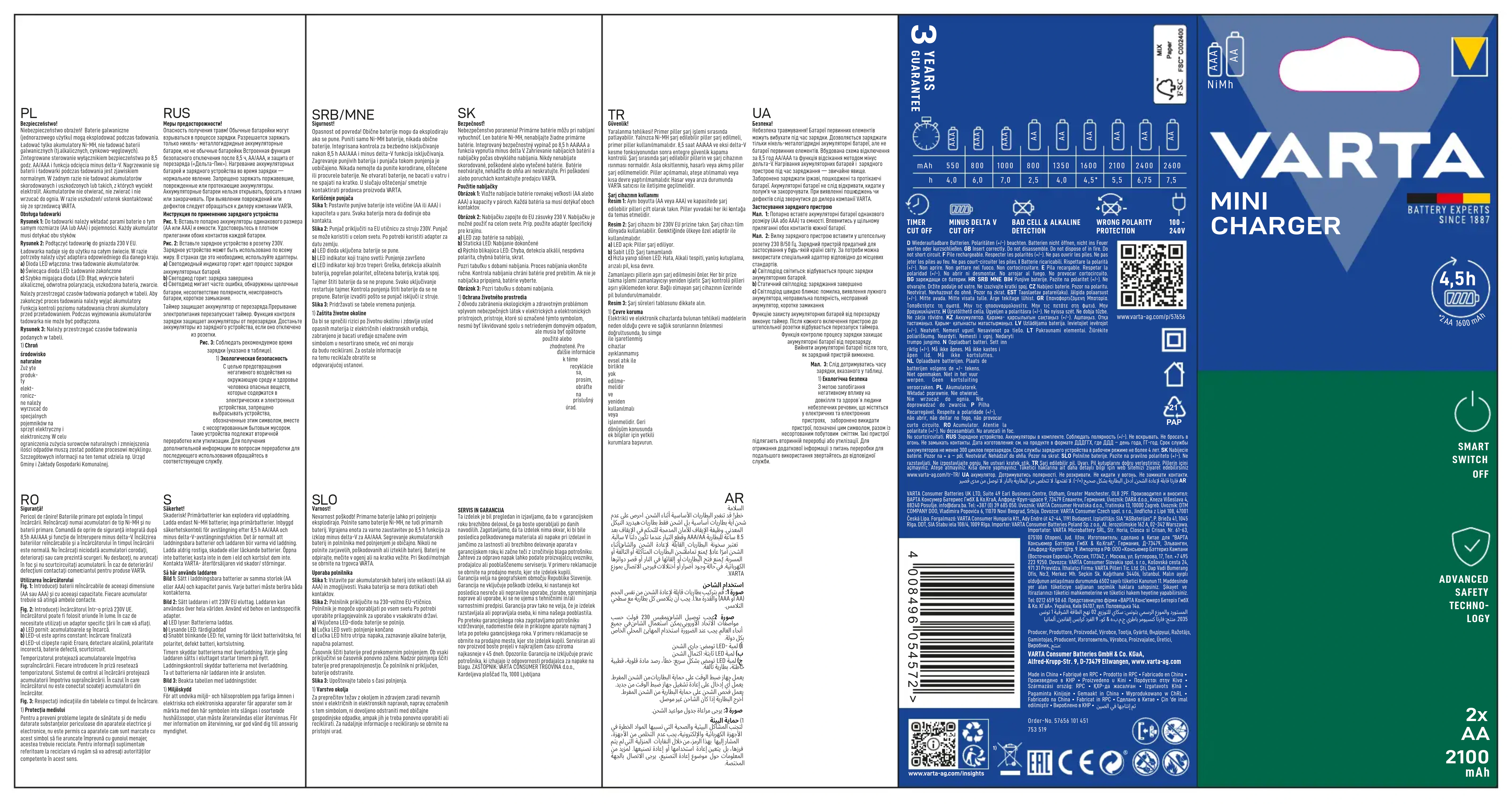 Sécurité! Risque de blessure! Les piles alcalines peuvent exploser en cas de charge. Charger uniquement des batteries Ni-MH et non les piles alcalines. Coupure de sécurité intégrée après 8,5h AA/AAA et fonction de coupure Minus Delta V. Un échauffement des piles rechargeables et du chargeur pendant la charge est normal. Ne jamais charger de batteries rouillées, endommagées ou présentant une fuite. Ne pas ouvrir les batteries, les jeter dans le feu ou les court-circuiter. Contacter le revendeur de VARTA en cas de dommages/défauts. Utilisation du chargeur Illustration n°1 : Insérer par paire des piles rechargeables de même taille (AA ou AAA) et de même capacité. Chaque pile doit être connectée aux deux pôles. Illustration n°2 : Brancher le chargeur dans une prise 230V EU. Le chargeur peut être utilisé dans le monde entier. Utiliser le cas échéant un adaptateur spécifique au pays. a) LED allumée: chargement des batteries. b) LED allumée : Charge complète c) LED clignote rapidement : Erreur, détection pile alcaline, polarité incorrecte, pile défectueuse, court-circuit. Le minuteur protège les batteries de la surcharge. Chaque branchement relance le minuteur. Le contrôle de charge protège les batteries contre toute surcharge. Retirer les batteries si le chargeur n'est pas branché. Illustration n°3 : Respecter le tableau des tempes de charge.