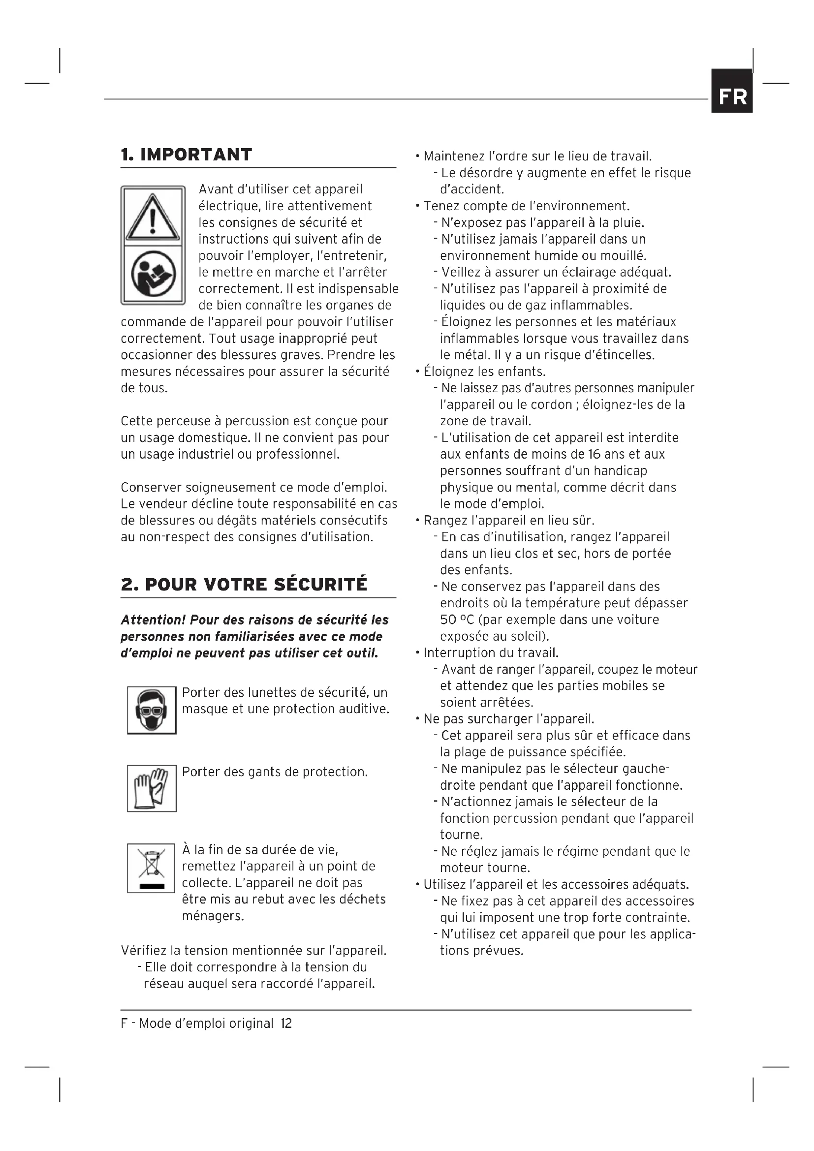 Attention! Pour des raisons de sécurité les personnes non familiarisées avec ce mode d’emploi ne peuvent pas utiliser cet outil. Porter des lunettes de sécurité, un masque et une protection auditive. Porter des gants de protection. À la fin de sa durée de vie, remettez l’appareil à un point de collecte. L’appareil ne doit pas être mis au rebut avec les déchets ménagers. Vérifiez la tension mentionnée sur l’appareil. - Elle doit correspondre à la tension du réseau auquel sera raccordé l’appareil.