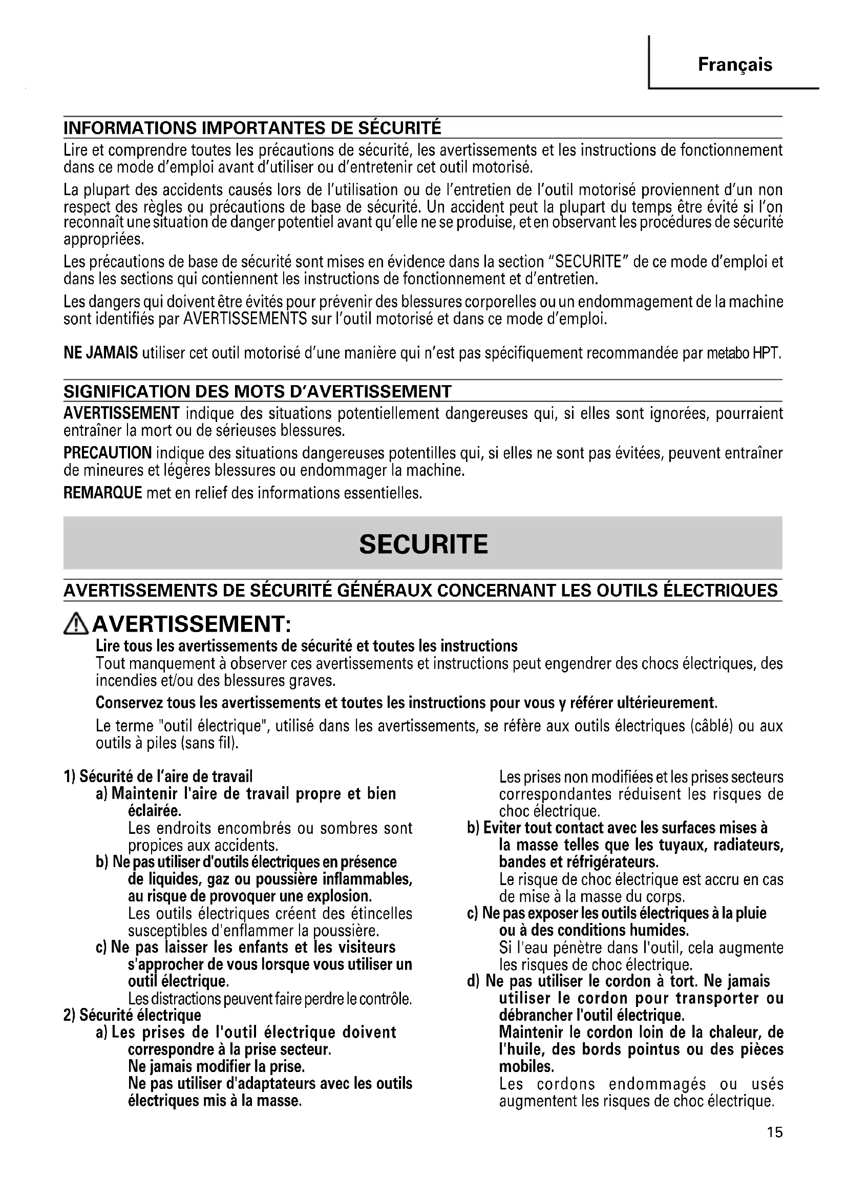 Lire et comprendre toutes les précautions de sécurité, les avertissements et les instructions de fonctionnement dans ce mode d’emploi avant d’utiliser ou d’entretenir cet outil motorisé. La plupart des accidents causés lors de l’utilisation ou de l’entretien de l’outil motorisé proviennent d’un non respect des règles ou précautions de base de sécurité. Un accident peut la plupart du temps être évité si l’on reconnaît une situation de danger potentiel avant qu’elle ne se produise, et en observant les procédures de sécurité appropriées. Les précautions de base de sécurité sont mises en évidence dans la section “SECURITE” de ce mode d’emploi et dans les sections qui contiennent les instructions de fonctionnement et d’entretien. Les dangers qui doivent être évités pour prévenir des blessures corporelles ou un endommagement de la machine sont identifiés par AVERTISSEMENTS sur l’outil motorisé et dans ce mode d’emploi. NE JAMAIS utiliser cet outil motorisé d’une manière qui n’est pas spécifiquement recommandée par metabo HPT.