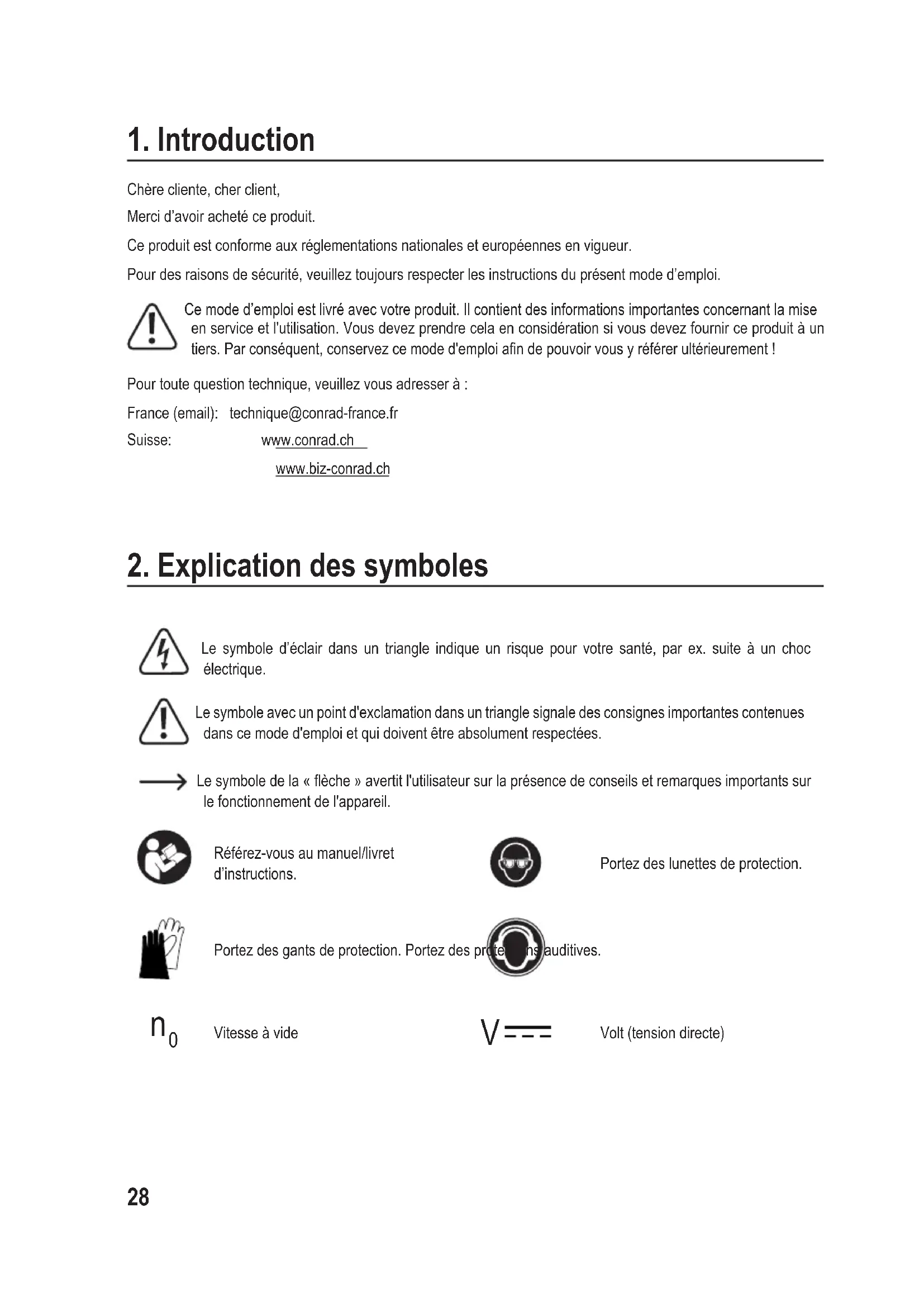 Chère cliente, cher client,Merci d’avoir acheté ce produit.Ce produit est conforme aux réglementations nationales et européennes en vigueur.Pour des raisons de sécurité, veuillez toujours respecter les instructions du présent mode d’emploi. Ce mode d’emploi est livré avec votre produit. Il contient des informations importantes concernant la mise en service et l'utilisation. Vous devez prendre cela en considération si vous devez fournir ce produit à un tiers. Par conséquent, conservez ce mode d'emploi an de pouvoir vous y référer ultérieurement !Pour toute question technique, veuillez vous adresser à :France (email): technique@conrad-france.frSuisse: www.conrad.ch www.biz-conrad.ch