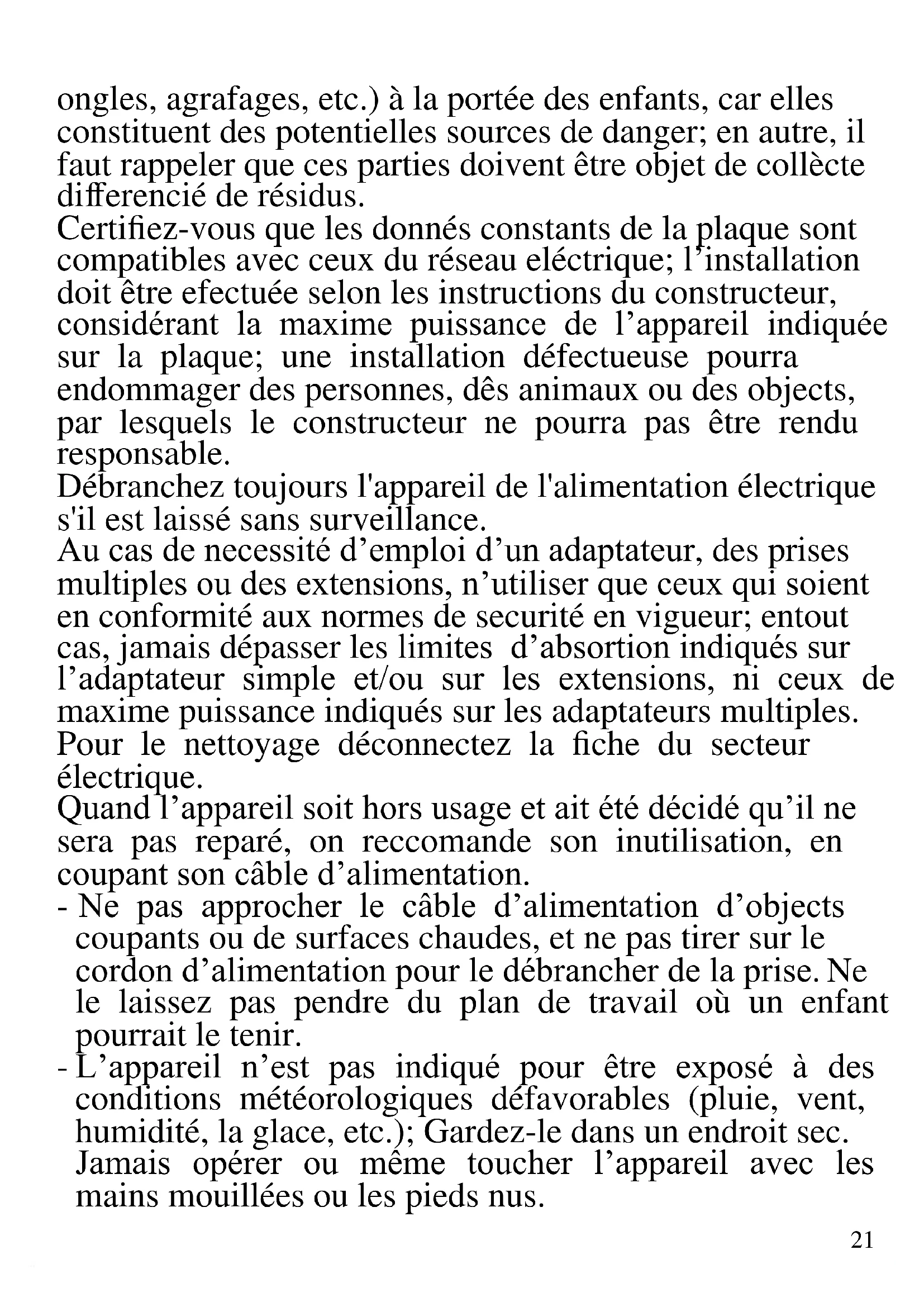 FRANCAIS: AVERTISSEMENT Les indications suivantes sont très importantes en ce qui concerne l’installation, usage et manutention de cet appareil; gardez soigneusement ce manuel pour des futures consultations; n’utilisez pas l’appareil que selon les indications de ce manuel d’instructions; n’importe quel autre type d’ utilisation devra être consideré inaproprié et potentiellement dangereux; pour cette raison le constructeur ne pourra pas être rendu responsable si des dommages résultants de l’utilisation inapropriée ou irresponsable de l’appareil se produisent. Ne pas laisser l’appareil inutilemente connecté a la prise eléctrique; c’est toujours mieux de le déconnecter quand il n’est pas à l’use. Avant de l’utilisation, certifiez-vous de l’integrité de l’appareil; en cas de doute ne l’utilisez pas et addressez- vous a l’assistence téchnique autoriséa; ne laissez pas des parties de l’emballage (sacs de plastique, polystirène,21 ongles, agrafages, etc.) à la portée des enfants, car elles constituent des potentielles sources de danger; en autre, il faut rappeler que ces parties doivent être objet de collècte differencié de résidus. Certifiez-vous que les donnés constants de la plaque sont compatibles avec ceux du réseau eléctrique; l’installation doit être efectuée selon les instructions du constructeur, considérant la maxime puissance de l’appareil indiquée sur la plaque; une installation défectueuse pourra endommager des personnes, dês animaux ou des objects, par lesquels le constructeur ne pourra pas être rendu responsable. Débranchez toujours l'appareil de l'alimentation électrique s'il est laissé sans surveillance. Au cas de necessité d’emploi d’un adaptateur, des prises multiples ou des extensions, n’utiliser que ceux qui soient en conformité aux normes de securité en vigueur; entout cas, jamais dépasser les limites d’absortion indiqués sur l’adaptateur simple et/ou sur les extensions, ni ceux de maxime puissance indiqués sur les adaptateurs multiples. Pour le nettoyage déconnectez la fiche du secteur électrique. Quand l’appareil soit hors usage et ait été décidé qu’il ne sera pas reparé, on reccomande son inutilisation, en coupant son câble d’alimentation. - Ne pas approcher le câble d’alimentation d’objects coupants ou de surfaces chaudes, et ne pas tirer sur le cordon d’alimentation pour le débrancher de la prise. Ne le laissez pas pendre du plan de travail où un enfant pourrait le tenir. - L’appareil n’est pas indiqué pour être exposé à des conditions météorologiques défavorables (pluie, vent, humidité, la glace, etc.); Gardez-le dans un endroit sec. Jamais opérer ou même toucher l’appareil avec les mains mouillées ou les pieds nus.22 - Ne pas utiliser l’appareil si le câble d’alimentation ou la fiche de connéction eléctrique sont endommagés, ou encore en cas de court-circuits; dans ce cas là, apporter l’appareil a un centre d’assistence autorisé. - Cet appareil peut être utilisé par des enfants agés de plus de 8 ans et par des personnes avec une réduite capacité phisique, sensorial ou mental, ou encore avec peu d’expérience à son usage, pourvu qu’une supervision adéquate leur en soit assuré, ou s’ils auraient été instruits à l’usage de l’appareil en complete securité. Les opérations de nettoyage e de manutention ne oivent pás être efectués par des enfants, sauf pour ceux qui sont agés de plus de 8 ans et sont supervisionés. - Gardez l’appareil et le câble d’alimentation hors la portée des enfants agés de moins de 8 ans. Si le câble d'alimentation est endommagé ou en cas de panne et / ou de dysfonctionnement, ne modifiez pas l'appareil. Toute réparation doit être effectuée par le fabricant ou par son service d'assistance technique ou, en tout cas, par une personne possédant une qualification similaire, afin d'éviter tout risque. Le non-respect de ce qui précède peut compromettre la sécurité de l'appareil et invalider les conditions de la garantie. ATTENTION: Cet appareil comporte une fonction de chauffage. Quelques surfaces, même si non la plaque elle même, pourront atteindre des températures élevées. Étant donné que la sensibilité à la température diffère de personne à personne, cet appareil devrà être usé avec PRUDENCE. Placez l’appareil sur des surfaces adéhrentes et préparées pour cet effet, et utilisez les mésures de protection contre la chaleur conseillées. - Les enfants ne doivent pas jouer avec cet appareil. - Cet appareil est destiné à être utilisé dans les ménages et des applications similaires: les cuisines du personnel dans les magasins, bureaux et autres environnements de23 travail, pour les clients dans les hôtels, motels et autres environnements de type résidentiel, de type lit et petit- déjeuner, hébergement. - L’appareil n’est pas conçu pour être utilisé avec une minuterie extérieure ou un commande à distance. - N’utiliser que des accéssoires e pièces d’origine. - Avant chaque utilisation, effectuez le cordon d'alimentation. Ne soumettez pas le produit à des chocs susceptibles de l'endommager. ATTENTION: Fonctionnement à induction. Ne pas utiliser sur des tables ou des surfaces en métal. - Tenir l’appareil à l’écart des environnements où il peut y avoir des gaz, vapeurs, des substances inflammables ou explosives. ATTENTION, RISQUE D'INCENDIE: Ne pas utiliser pour quelque raison que ce soit sur: - tables ou surfaces métalliques - plaques de cuisson ou poêles - réfrigérateurs et congélateurs dans le cockpit - autres surfaces à âme métallique Le fonctionnement par induction, tout en chauffant la casserole, pourrait également chauffer la surface de support métallique, la rendant dans certains cas incandescente. Avant d'utiliser l'appareil, vérifiez également qu'il n'y a pas d'objets métalliques en dessous.