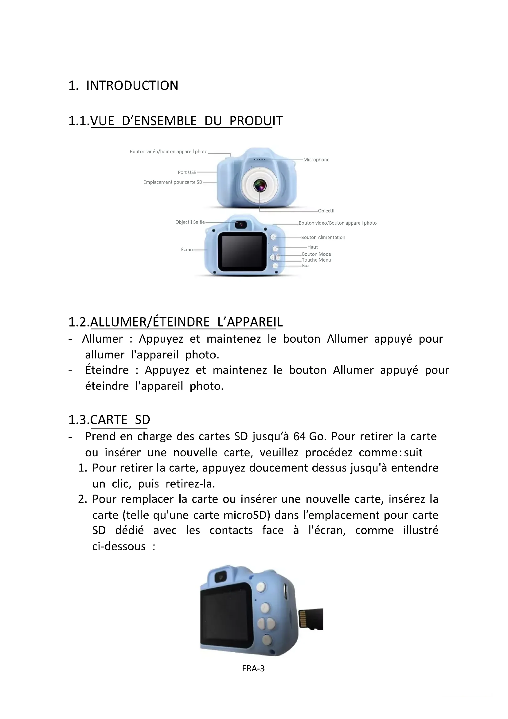 carte (telle qu'une carte microSD) dans l’emplacement pour carte SD dédié avec les contacts face à l'écran, comme illustré ci-dessous : Bouton vidéo/bouton appareil photo Port USB Emplacement pour carte SD Objectif Selfie Écran Microphone Objectif Bouton vidéo/Bouton appareil photo Bouton Alimentation Haut Bouton Mode Touche Menu BasFRA-4 Remarque : - Avant d'insérer ou de remplacer une carte microSD, assurez-vous que l'appareil est éteint. - Lors de l'insertion de la carte microSD, assurez-vous qu'elle est correctement orientée.