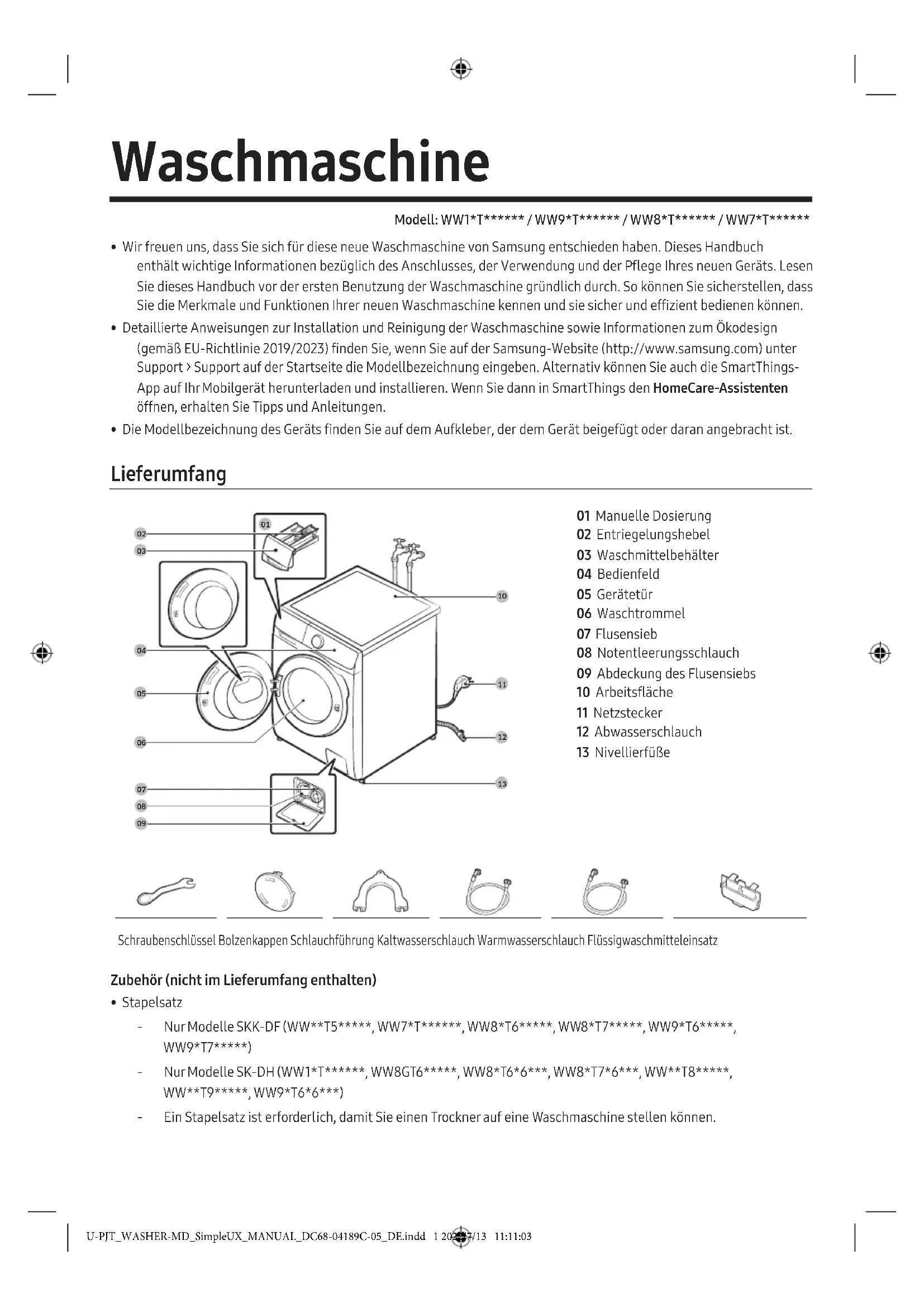 - Pour obtenir les instructions détaillées d'installation et de nettoyage du lave-linge, ainsi que des informations relatives à l'écoconception (conformément à la directive (UE) 2019/2023), consultez le site Internet de Samsung (http://www.samsung.com) et allez dans Assistance > page d'accueil de Assistance, puis saisissez le nom du modèle. Vous pouvez également télécharger et installer l'application SmartThings sur votre appareil mobile, puis ouvrir l'assistant HomeCare dans SmartThings pour obtenir des conseils et astuces.