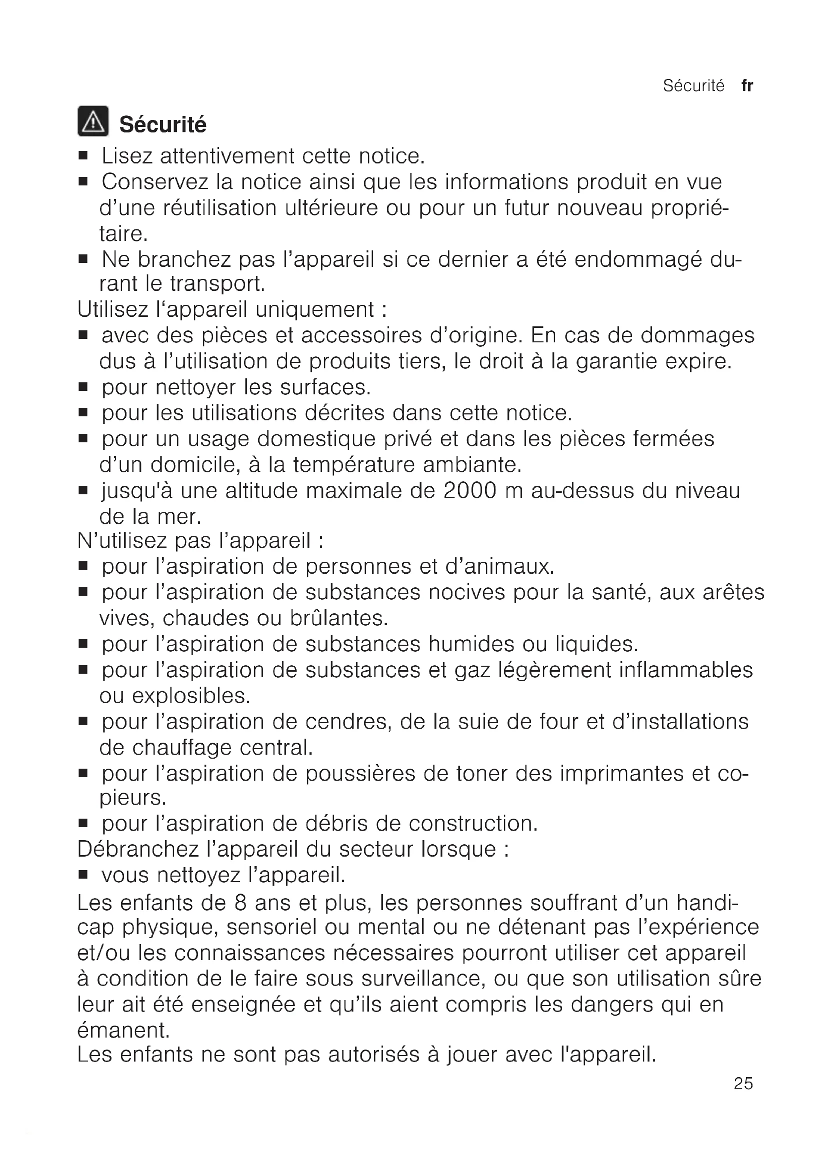 Sécurité ¡ Lisez attentivement cette notice. ¡ Conservez la notice ainsi que les informations produit en vue d’une réutilisation ultérieure ou pour un futur nouveau proprié- taire. ¡ Ne branchez pas l’appareil si ce dernier a été endommagé du- rant le transport. Utilisez l‘appareil uniquement: ¡ avec des pièces et accessoires d’origine. En cas de dommages dus à l’utilisation de produits tiers, le droit à la garantie expire. ¡ pour nettoyer les surfaces. ¡ pour les utilisations décrites dans cette notice. ¡ pour un usage domestique privé et dans les pièces fermées d’un domicile, à la température ambiante. ¡ jusqu'à une altitude maximale de 2000m au-dessus du niveau de la mer. N’utilisez pas l’appareil: ¡ pour l’aspiration de personnes et d’animaux. ¡ pour l’aspiration de substances nocives pour la santé, aux arêtes vives, chaudes ou brûlantes. ¡ pour l’aspiration de substances humides ou liquides. ¡ pour l’aspiration de substances et gaz légèrement inflammables ou explosibles. ¡ pour l’aspiration de cendres, de la suie de four et d’installations de chauffage central. ¡ pour l’aspiration de poussières de toner des imprimantes et co- pieurs. ¡ pour l’aspiration de débris de construction. Débranchez l’appareil du secteur lorsque: ¡ vous nettoyez l’appareil. Les enfants de 8 ans et plus, les personnes souffrant d’un handi- cap physique, sensoriel ou mental ou ne détenant pas l’expérience et/ou les connaissances nécessaires pourront utiliser cet appareil à condition de le faire sous surveillance, ou que son utilisation sûre leur ait été enseignée et qu’ils aient compris les dangers qui en émanent. Les enfants ne sont pas autorisés à jouer avec l'appareil.fr Sécurité