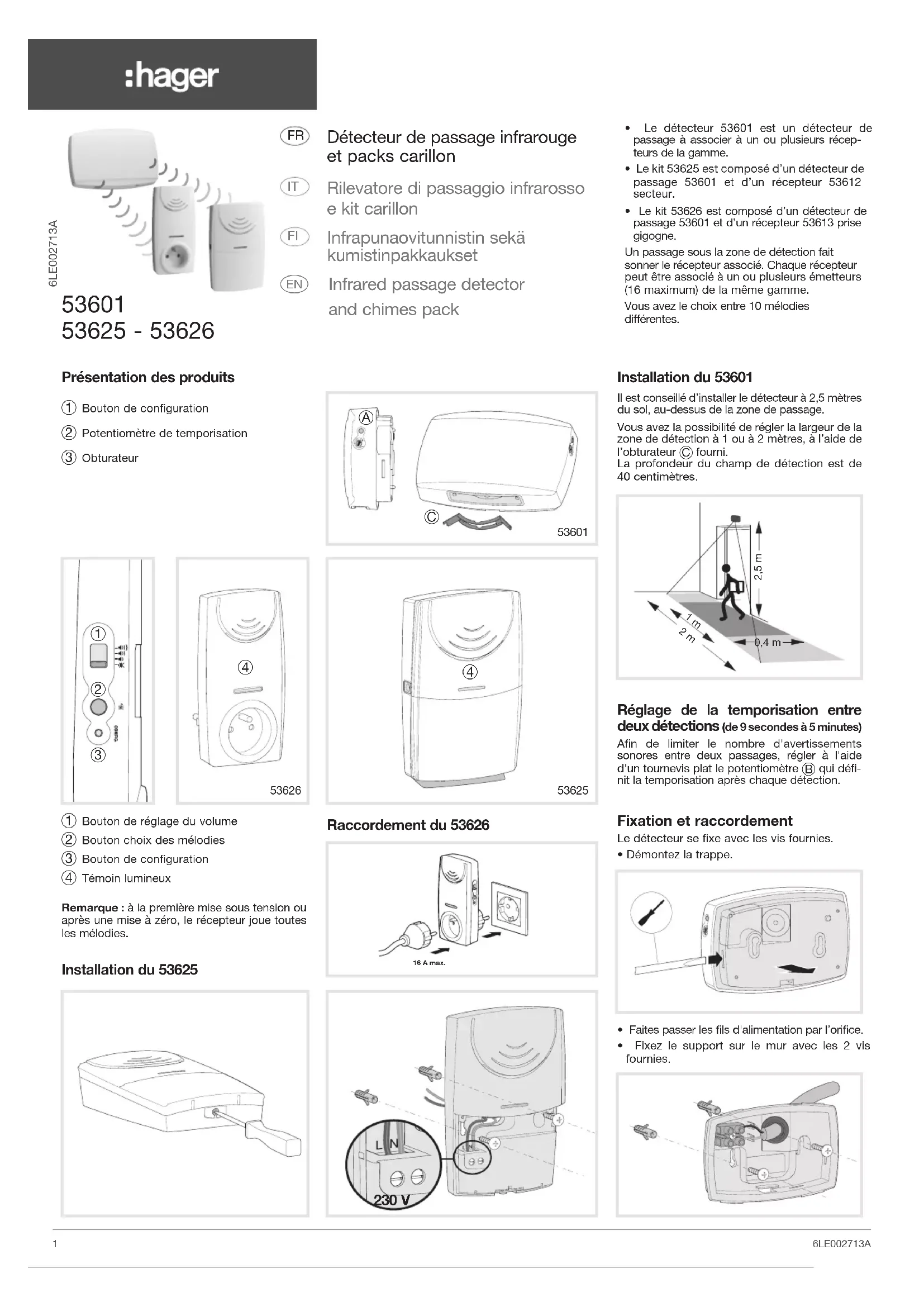 - Le kit 53625 est composé d’un détecteur de passage 53601 et d’un récepteur 53612 secteur.