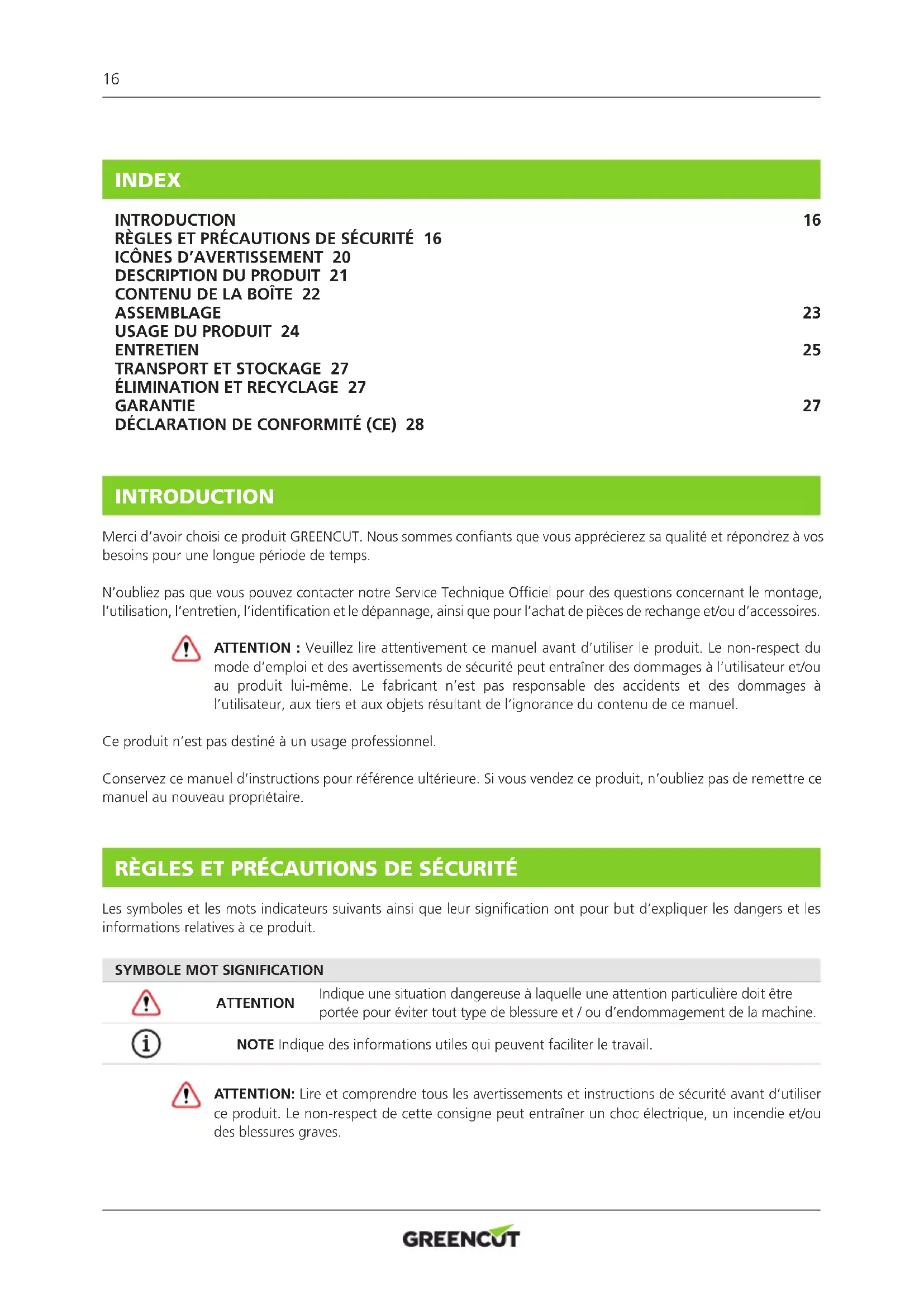 - Directiva 2006/42/CE del Parlamento Europeo y del Consejo, de 17 de mayo de 2006, relativa a las máquinas y por la que se modica la Directiva 95/16/CE. Normas armonizadas: EN 60335-1:2012/A2:2019, EN 50636-2-92:2014. El producto entregado coincide con el ejemplar que fue sometido al examen CE de tipo. Valls (SPAIN), 10 de octubre del 2020, Albert Prat Asensio, CEO (Representante autorizado y responsable de la documentación técnica).16 INTRODUCTION Merci d’avoir choisi ce produit GREENCUT. Nous sommes conants que vous apprécierez sa qualité et répondrez à vos besoins pour une longue période de temps. N’oubliez pas que vous pouvez contacter notre Service Technique Ofciel pour des questions concernant le montage, l’utilisation, l’entretien, l’identication et le dépannage, ainsi que pour l’achat de pièces de rechange et/ou d’accessoires. ATTENTION : Veuillez lire attentivement ce manuel avant d’utiliser le produit. Le non-respect du mode d’emploi et des avertissements de sécurité peut entraîner des dommages à l’utilisateur et/ou au produit lui-même. Le fabricant n’est pas responsable des accidents et des dommages à l’utilisateur, aux tiers et aux objets résultant de l’ignorance du contenu de ce manuel. Ce produit n’est pas destiné à un usage professionnel. Conservez ce manuel d’instructions pour référence ultérieure. Si vous vendez ce produit, n’oubliez pas de remettre ce manuel au nouveau propriétaire. RÈGLES ET PRÉCAUTIONS DE SÉCURITÉ Les symboles et les mots indicateurs suivants ainsi que leur signication ont pour but d’expliquer les dangers et les informations relatives à ce produit.