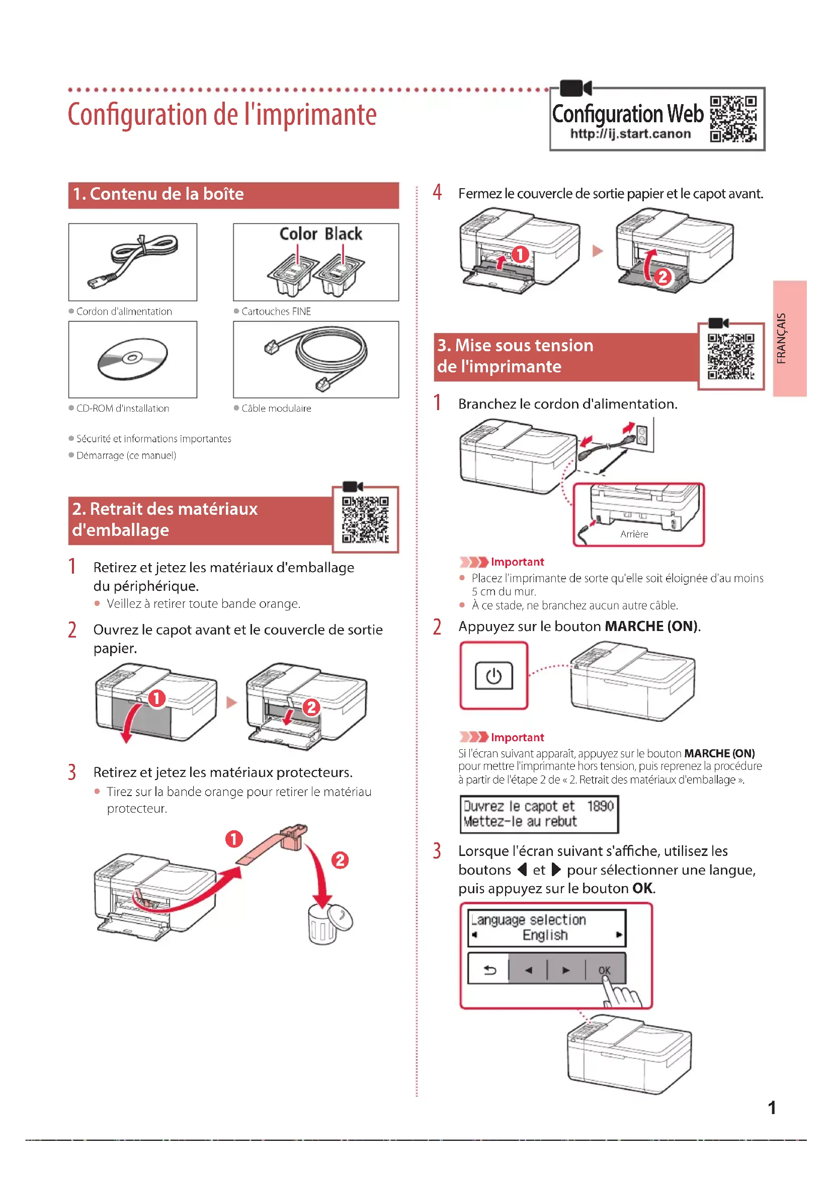 Branchez le cordon d'alimentation. Arrière Important Placez l'imprimante de sorte qu'elle soit éloignée d'au moins 5cm du mur. À ce stade, ne branchez aucun autre câble. Appuyez sur le bouton MARCHE (ON). Important Si l'écran suivant apparaît, appuyez sur le bouton MARCHE (ON) pour mettre l'imprimante hors tension, puis reprenez la procédure à partir de l'étape2 de «2. Retrait des matériaux d'emballage». Lorsque l'écran suivant s'ache, utilisez les boutons [ et ] pour sélectionner une langue, puis appuyez sur le bouton OK. Conguration de l'imprimante Conguration Web2 Conguration de l'imprimante