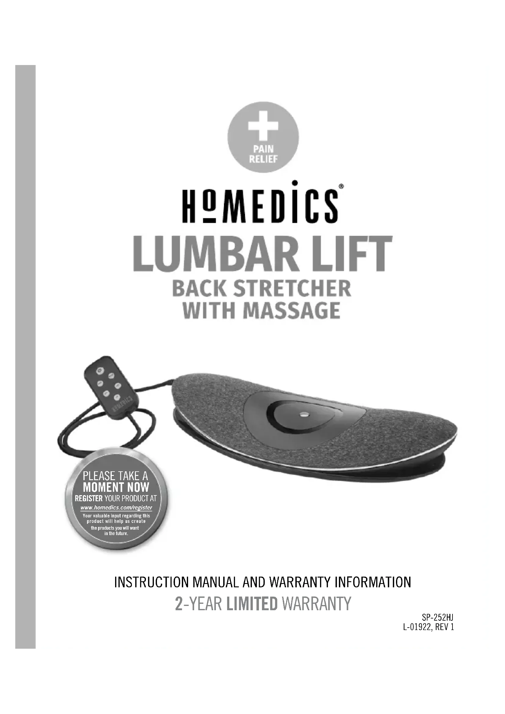 cservice@homedicsgroup.ca 8:30am–5:00pm EST Monday–Friday 1-888-225-7378GARANTIE LIMITÉE DE 2 ANS SP-252HJ L-01922, REV 1 MODE D’EMPLOI ET INFORMATIONS SUR LA GARANTIE www.homedics.com/register Votre contribution précieuse concernant ce produit nous aidera à créer les produits que vous voudrez à l’avenir. VEUILLEZ PRENDRE