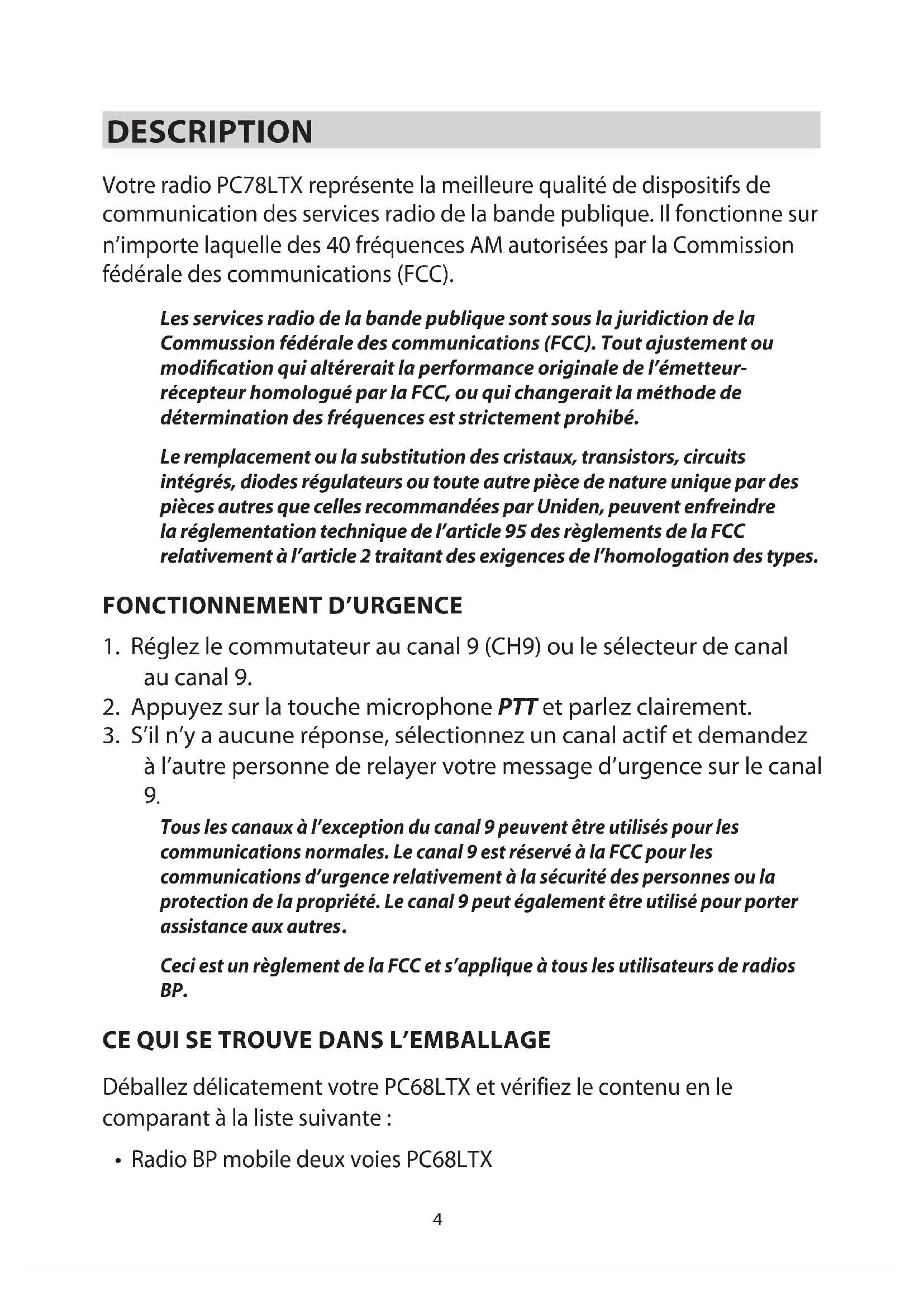 DESCRIPTION Votre radio PC78LTX représente la meilleure qualité de dispositifs de communication des services radio de la bande publique. Il fonctionne sur n’importe laquelle des 40 fréquences AM autorisées par la Commission fédérale des communications (FCC). Les services radio de la bande publique sont sous la juridiction de la Commussion fédérale des communications (FCC). Tout ajustement ou modication qui altérerait la performance originale de l’émetteur- récepteur homologué par la FCC, ou qui changerait la méthode de détermination des fréquences est strictement prohibé. Le remplacement ou la substitution des cristaux, transistors, circuits intégrés, diodes régulateurs ou toute autre pièce de nature unique par des pièces autres que celles recommandées par Uniden, peuvent enfreindre la réglementation technique de l’article 95 des règlements de la FCC relativement à l’article 2 traitant des exigences de l’homologation des types.