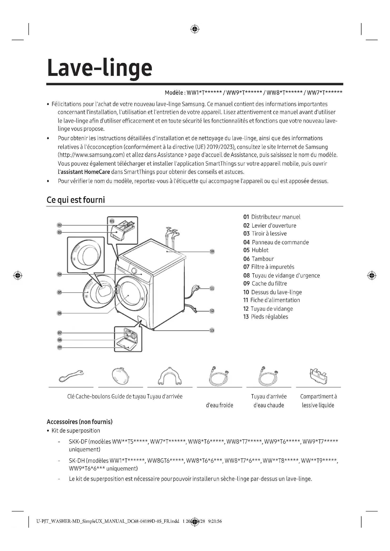 - Kit de superposition ‐ SKK-DF (modèles WW**T5*****, WW7*T******, WW8*T6*****, WW8*T7*****, WW9*T6*****, WW9*T7***** uniquement) ‐ SK-DH (modèles WW1*T******, WW8GT6*****, WW8*T6*6***, WW8*T7*6***, WW**T8*****, WW**T9*****, WW9*T6*6*** uniquement) ‐ Le kit de superposition est nécessaire pour pouvoir installer un sèche-linge par-dessus un lave-linge. U-PJT_WASHER-MD_SimpleUX_MANUAL_DC68-04189D-05_FR.indd 1 2022/9/28 9:21:56Français2 Consignes de sécurité REMARQUE