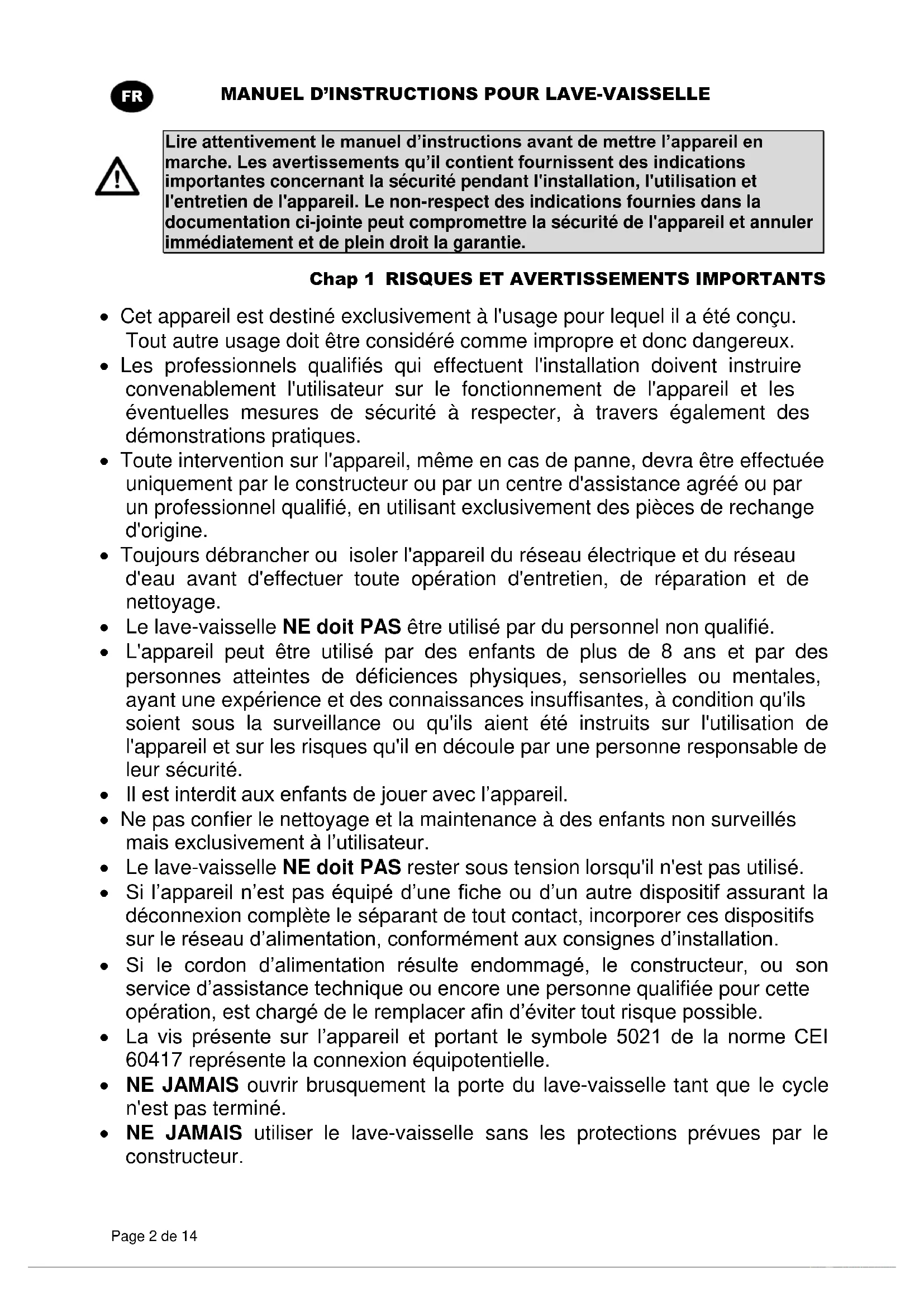 Lire attentivement le manuel d’instructions avant de mettre l’appareil en marche. Les avertissements qu’il contient fournissent des indications importantes concernant la sécurité pendant l'installation, l'utilisation et l'entretien de l'appareil. Le non-respect des indications fournies dans la documentation ci-jointe peut compromettre la sécurité de l'appareil et annuler immédiatement et de plein droit la garantie. Chap 1 RISQUES ET AVERTISSEMENTS IMPORTANTS Cet appareil est destiné exclusivement à l'usage pour lequel il a été conçu. Tout autre usage doit être considéré comme impropre et donc dangereux. Les professionnels qualifiés qui effectuent l'installation doivent instruire convenablement l'utilisateur sur le fonctionnement de l'appareil et les éventuelles mesures de sécurité à respecter, à travers également des démonstrations pratiques. Toute intervention sur l'appareil, même en cas de panne, devra être effectuée uniquement par le constructeur ou par un centre d'assistance agréé ou par un professionnel qualifié, en utilisant exclusivement des pièces de rechange d'origine. Toujours débrancher ou isoler l'appareil du réseau électrique et du réseau d'eau avant d'effectuer toute opération d'entretien, de réparation et de nettoyage. Le lave-vaisselle NE doit PAS être utilisé par du personnel non qualifié. L'appareil peut être utilisé par des enfants de plus de 8 ans et par des personnes atteintes de déficiences physiques, sensorielles ou mentales, ayant une expérience et des connaissances insuffisantes, à condition qu'ils soient sous la surveillance ou qu'ils aient été instruits sur l'utilisation de l'appareil et sur les risques qu'il en découle par une personne responsable de leur sécurité. Il est interdit aux enfants de jouer avec l’appareil. Ne pas confier le nettoyage et la maintenance à des enfants non surveillés mais exclusivement à l’utilisateur. Le lave-vaisselle NE doit PAS rester sous tension lorsqu'il n'est pas utilisé. Si l’appareil n’est pas équipé d’une fiche ou d’un autre dispositif assurant la déconnexion complète le séparant de tout contact, incorporer ces dispositifs sur le réseau d’alimentation, conformément aux consignes d’installation. Si le cordon d’alimentation résulte endommagé, le constructeur, ou son service d’assistance technique ou encore une personne qualifiée pour cette opération, est chargé de le remplacer afin d’éviter tout risque possible. La vis présente sur l’appareil et portant le symbole 5021 de la norme CEI 60417 représente la connexion équipotentielle. NE JAMAIS ouvrir brusquement la porte du lave-vaisselle tant que le cycle n'est pas terminé. NE JAMAIS utiliser le lave-vaisselle sans les protections prévues par le constructeur.MANUEL D’INSTRUCTIONS POUR LAVE-VAISSELLE Page 3 de 14