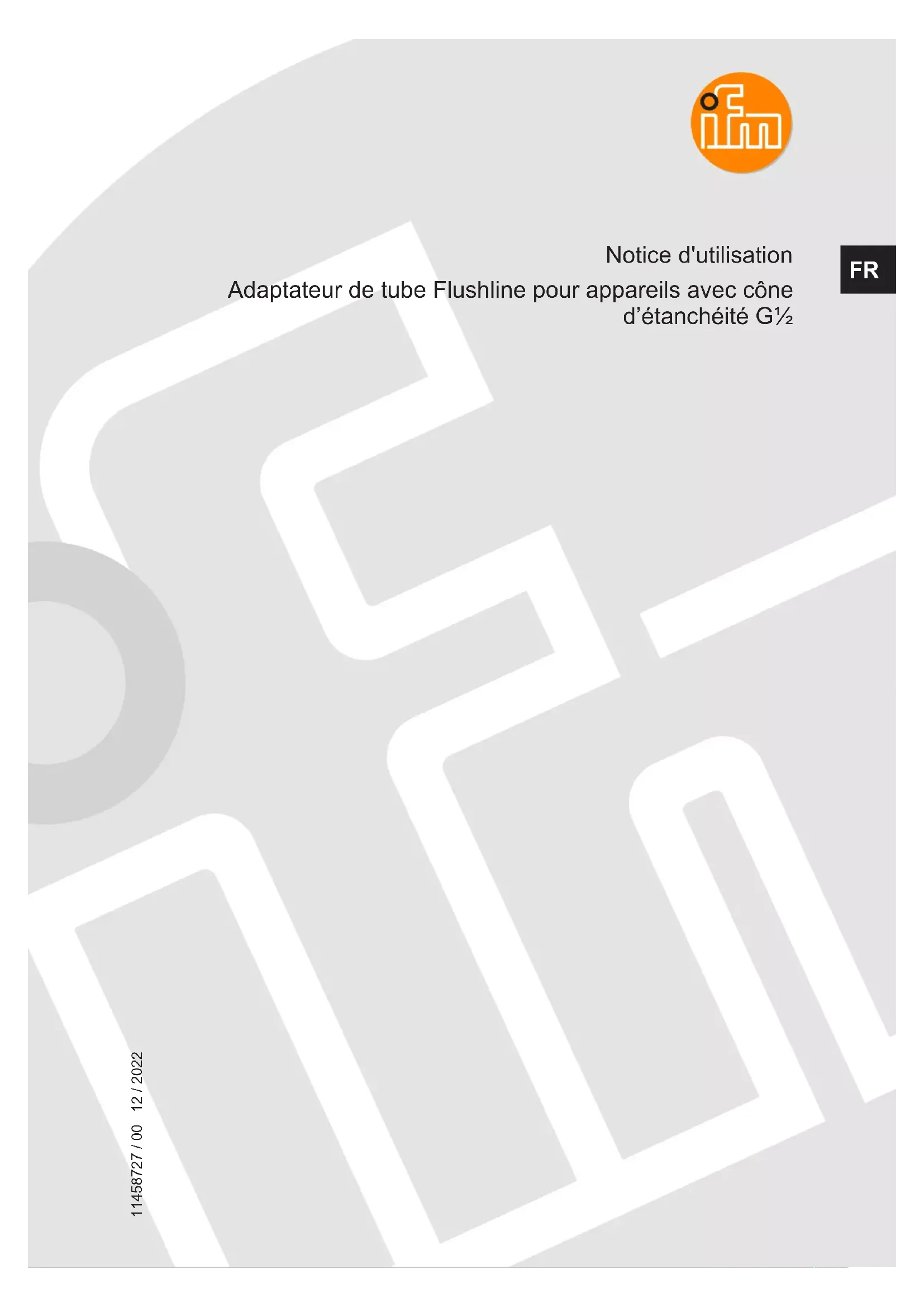 1 Remarques préliminaires Notice d’utilisation, données techniques, homologations et informations supplémentaires via le code QR sur l’appareil / l’emballage ou sur www.ifm.com. 1.1 Symboles utilisés Condition préalable Action à effectuer Réaction, résultat [...] Désignation d'une touche, d'un bouton ou d'un affichage Référence Remarque importante Le non-respect peut aboutir à des dysfonctionnements ou perturbations Information Remarque supplémentaire 1.2 Avertissements utilisés ATTENTION Avertissement de dommages corporels w Danger de blessures légères, réversibles.Adaptateur de tube Flushline pour appareils avec cône d’étanchéité G½