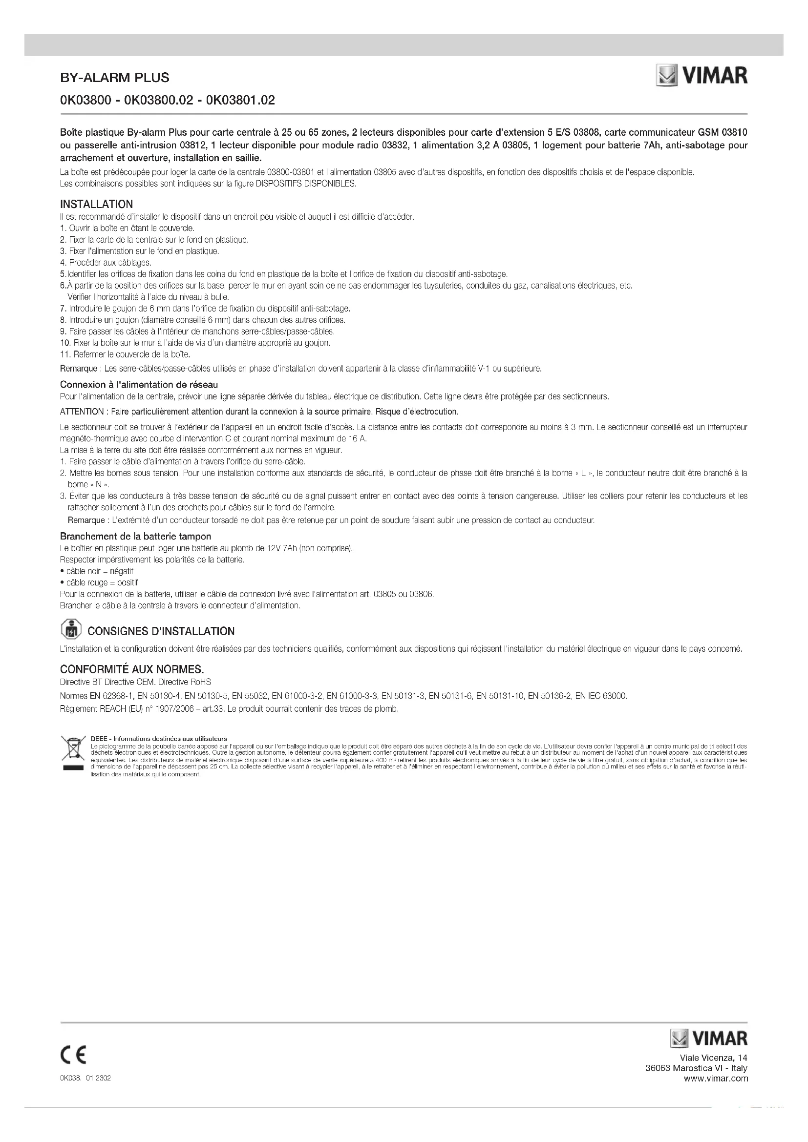 Viale Vicenza, 14 36063 Marostica VI - Italy www.vimar.com 0K038. 01 2302 0K03800 - 0K03800.02 - 0K03801.02 BY-ALARM PLUS Boîte plastique By-alarm Plus pour carte centrale à 25 ou 65 zones, 2 lecteurs disponibles pour carte d’extension 5 E/S 03808, carte communicateur GSM 03810 ou passerelle anti-intrusion 03812, 1 lecteur disponible pour module radio 03832, 1 alimentation 3,2 A 03805, 1 logement pour batterie 7Ah, anti-sabotage pour arrachement et ouverture, installation en saillie. La boîte est prédécoupée pour loger la carte de la centrale 03800-03801 et l'alimentation 03805 avec d’autres dispositifs, en fonction des dispositifs choisis et de l'espace disponible. Les combinaisons possibles sont indiquées sur la figure DISPOSITIFS DISPONIBLES. INSTALLATION Il est recommandé d’installer le dispositif dans un endroit peu visible et auquel il est difficile d’accéder.