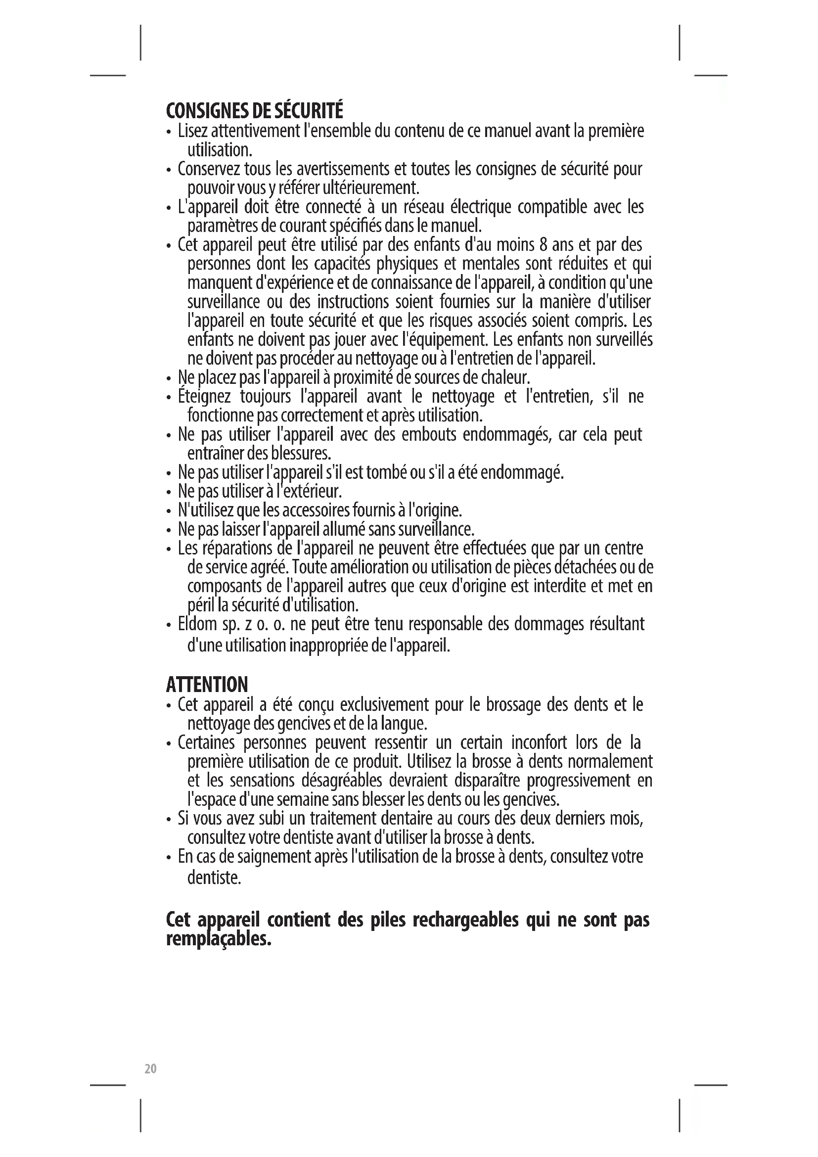 - En cas de saignement après l'utilisation de la brosse à dents, consultez votre dentiste. Cet appareil contient des piles rechargeables qui ne sont pas remplaçables.21