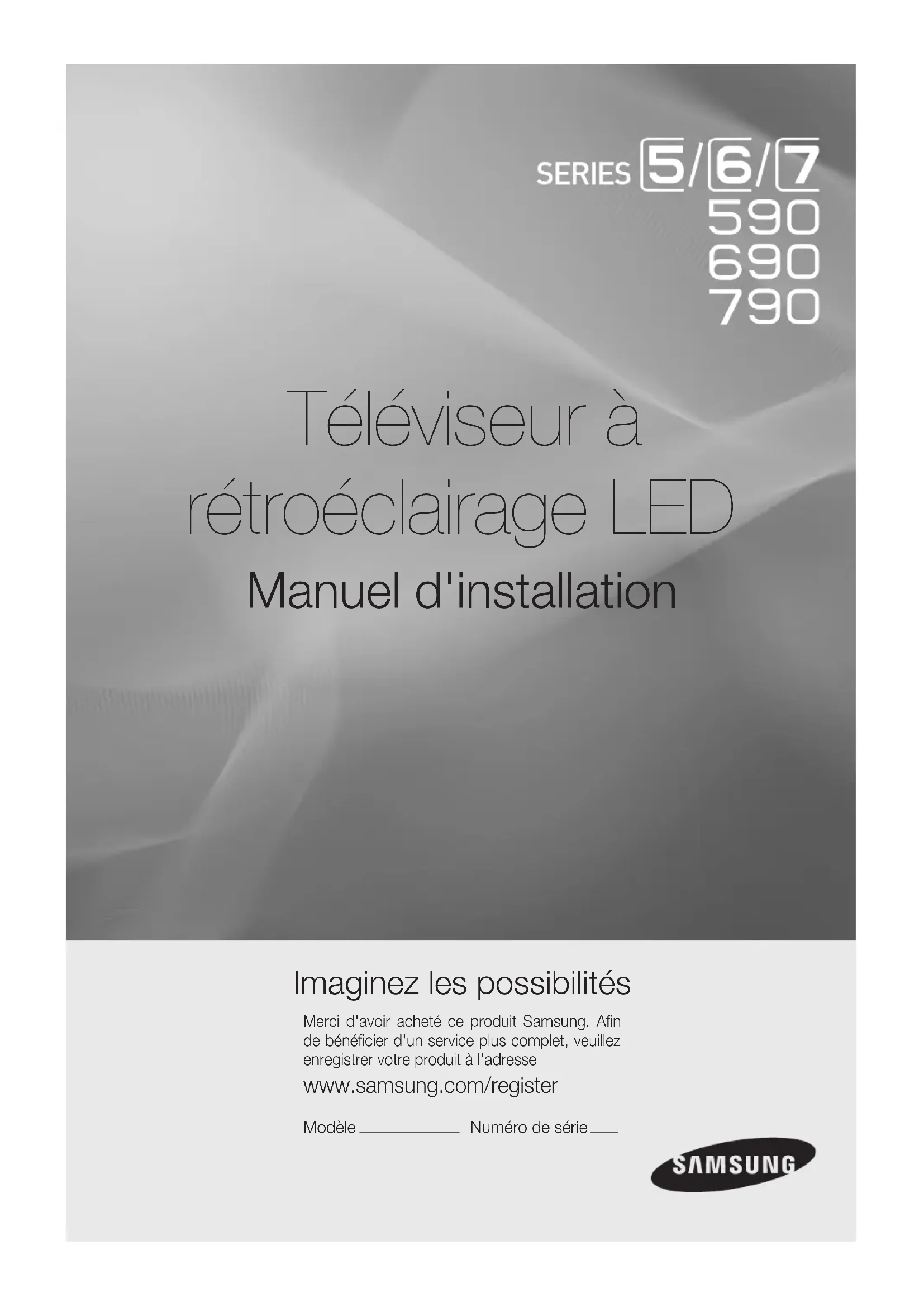 Téléviseur à rétroéclairage LED Manuel d'installation Imaginez les possibilités Merci d'avoir acheté ce produit Samsung. Afin de bénéficier d'un service plus complet, veuillez enregistrer votre produit à l'adresse www.samsung.com/register Modèle Numéro de sérieLes figures et illustrations contenues dans ce mode d'emploi sont fournies pour référence uniquement. Elles peuvent différer de l'aspect réel du produit. La conception et les spécifications du produit sont susceptibles d'être modifiées sans préavis. Instructions Ce téléviseur propose des fonctionnalités interactives via un boîtier set-back box (SBB/STB) connecté au téléviseur et d'autres téléviseurs sur un système contrôlé par ordinateur pour les hôtels et autres lieux d'accueil. Interactif: à sa première mise sous tension, le téléviseur envoie une commande pour identifier le SBB/STB. En cas d'identification, il passe en mode EN LIGNE et le contrôle passe entièrement par le SBB/STB. En mode EN LIGNE, le téléviseur ne reçoit plus les commandes infrarouges (Samsung Remote) et fonctionne selon le protocole d'interface. Autonome: si le SBB/STB n'est pas identifié, le téléviseur passe en mode AUTONOME avec un fonctionnement restreint. Modes de fonctionnement Si ce téléviseur (en mode Hotel) fonctionne avec un SBB/STB, il s'agit d'un des deux états suivants: