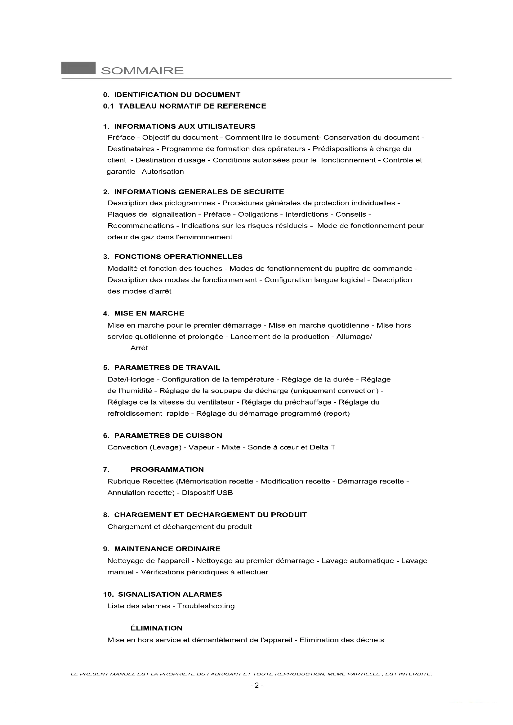 - Dommages provoqués par le non-respect des procédures décrites sur ce document. Autorisation Par autorisation, on entend le consentement à entreprendre une activité liée à l'appareil. L'autorisation est accordée par la personne responsable de l'appareil (constructeur, acheteur, signataire, concessionnaire et/ou propriétaire du bâtiment).5 LE PRESENT MANUEL EST LA PROPRIETE DU FABRICANT ET TOUTE REPRODUCTION, MEME PARTIELLE , EST INTERDITE.