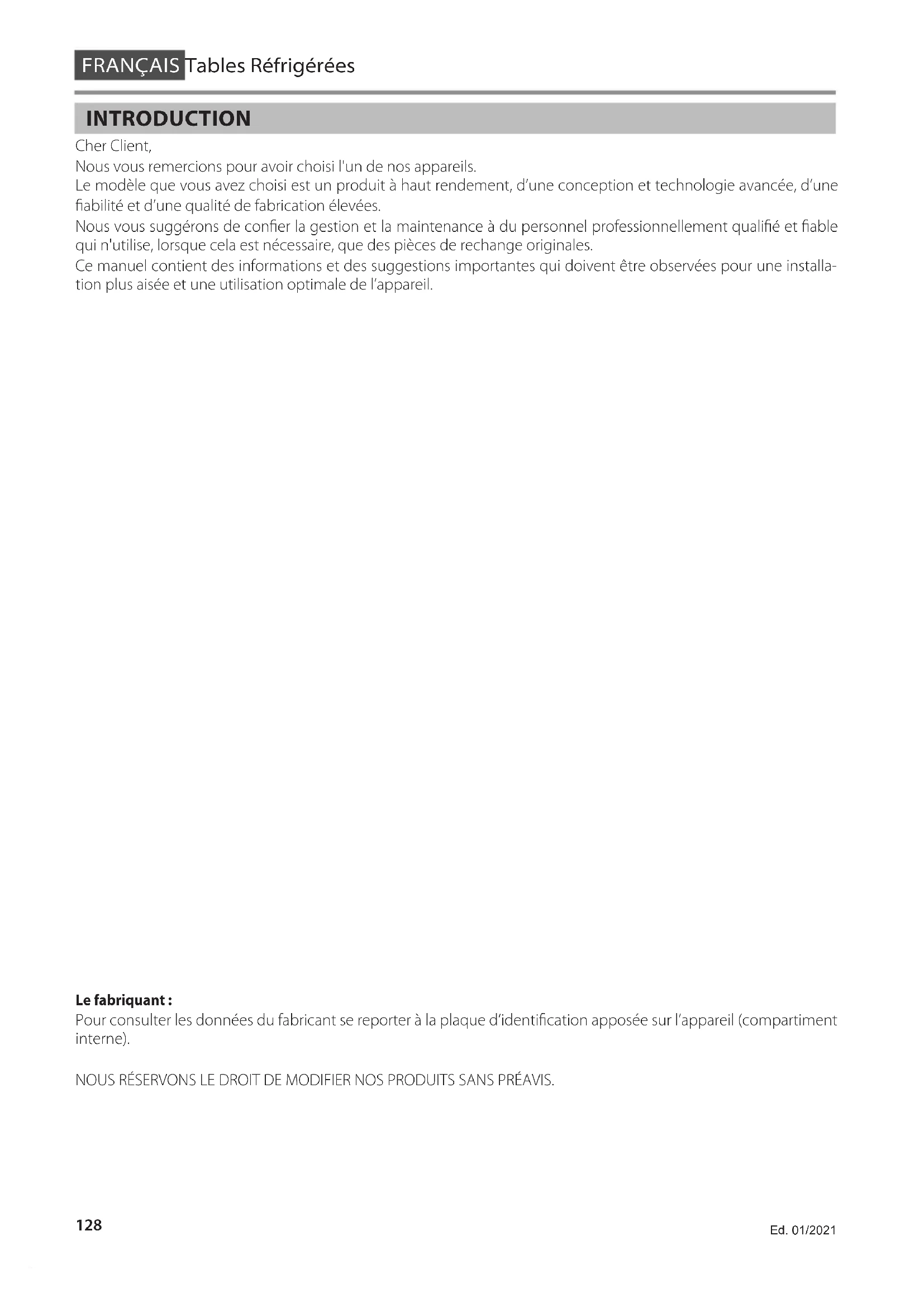 Ed. 01/2021 INTRODUCTION Cher Client, Nous vous remercions pour avoir choisi l'un de nos appareils. Le modèle que vous avez choisi est un produit à haut rendement, d’une conception et technologie avancée, d’une fiabilité et d’une qualité de fabrication élevées. Nous vous suggérons de confier la gestion et la maintenance à du personnel professionnellement qualifié et fiable qui n'utilise, lorsque cela est nécessaire, que des pièces de rechange originales. Ce manuel contient des informations et des suggestions importantes qui doivent être observées pour une installa- tion plus aisée et une utilisation optimale de l’appareil. Le fabriquant : Pour consulter les données du fabricant se reporter à la plaque d’identification apposée sur l’appareil (compartiment interne). NOUS RÉSERVONS LE DROIT DE MODIFIER NOS PRODUITS SANS PRÉAVIS. FRANÇAIS Tables RéfrigéréesFRANÇAISTables Réfrigérées