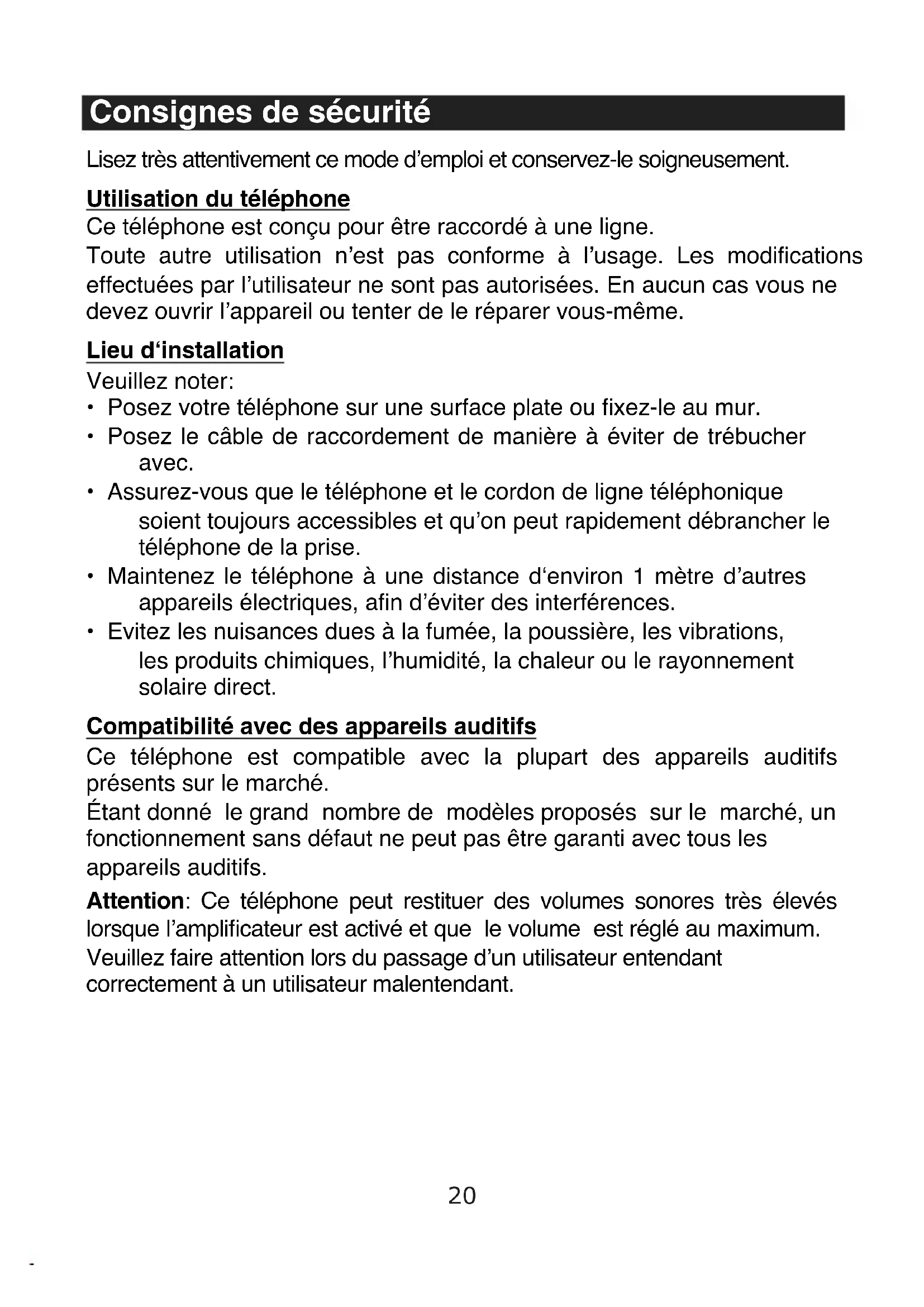 - Sous réserve de disponibilité du service Présentation du numéro (consultez votre opérateur de téléphonique xe)23 Mise en service du téléphone Important : veuillez lire les consignes de sécurité de la page 117 avant la mise en service du téléphone. Attention : Ce téléphone peut restituer des volumes sonores très élevés lorsque l’amplicateur est activé et que le volume est réglé au maximum. Veuillez faire attention lors du passage d’un utilisateur entendant correctement à un utilisateur malentendant. Vérification du contenu du coffret Font partie des objets fournis: