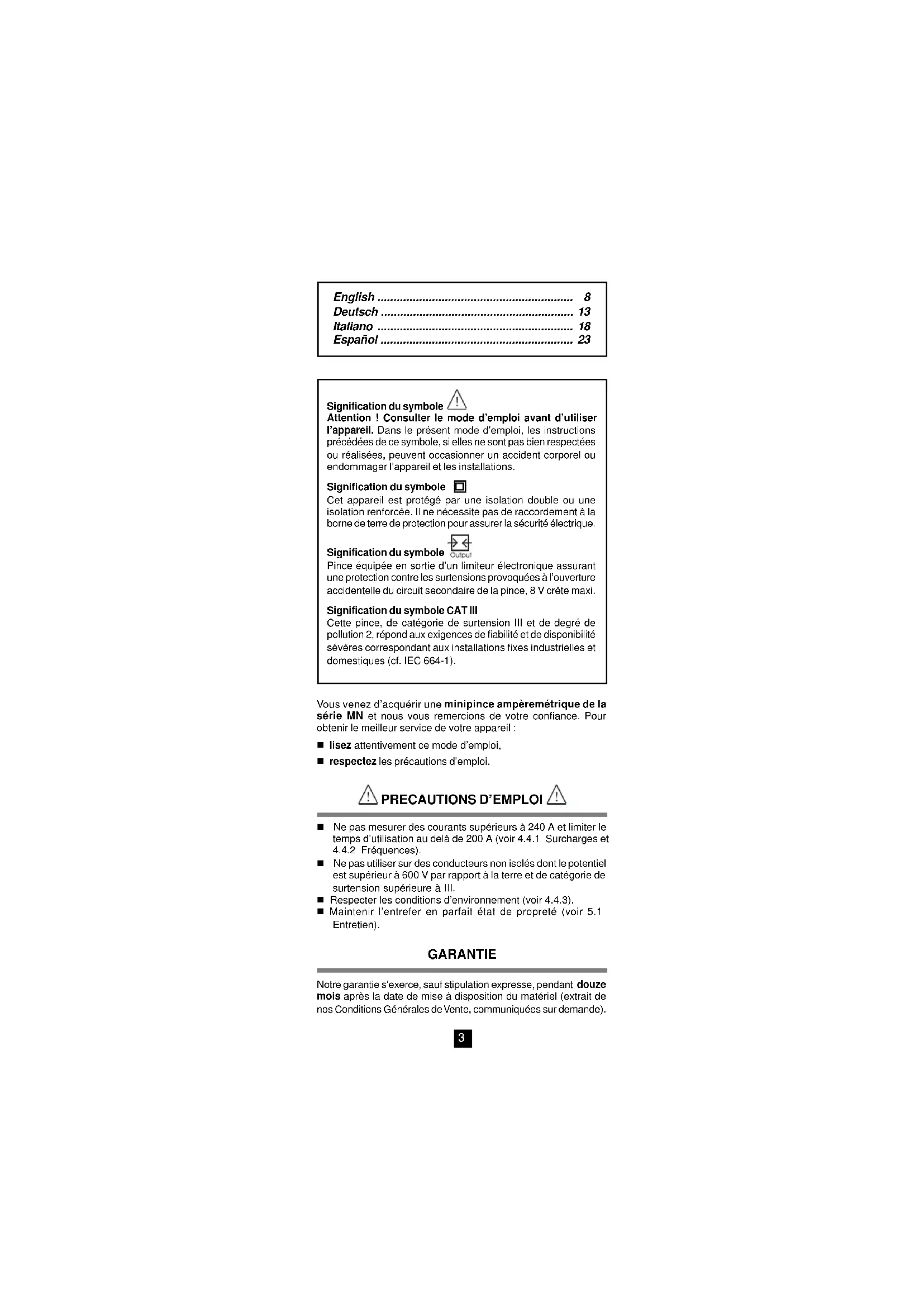 - n Ne pas utiliser sur des conducteurs non isolés dont le potentiel est supérieur à 600 V par rapport à la terre et de catégorie de surtension supérieure à III. n Respecter les conditions d’environnement (voir 4.4.3). n Maintenir l’entrefer en parfait état de propreté (voir 5.1 Entretien). GARANTIE Notre garantie s’exerce, sauf stipulation expresse, pendant douze mois après la date de mise à disposition du matériel (extrait de nos Conditions Générales de Vente, communiquées sur demande). English p. 8