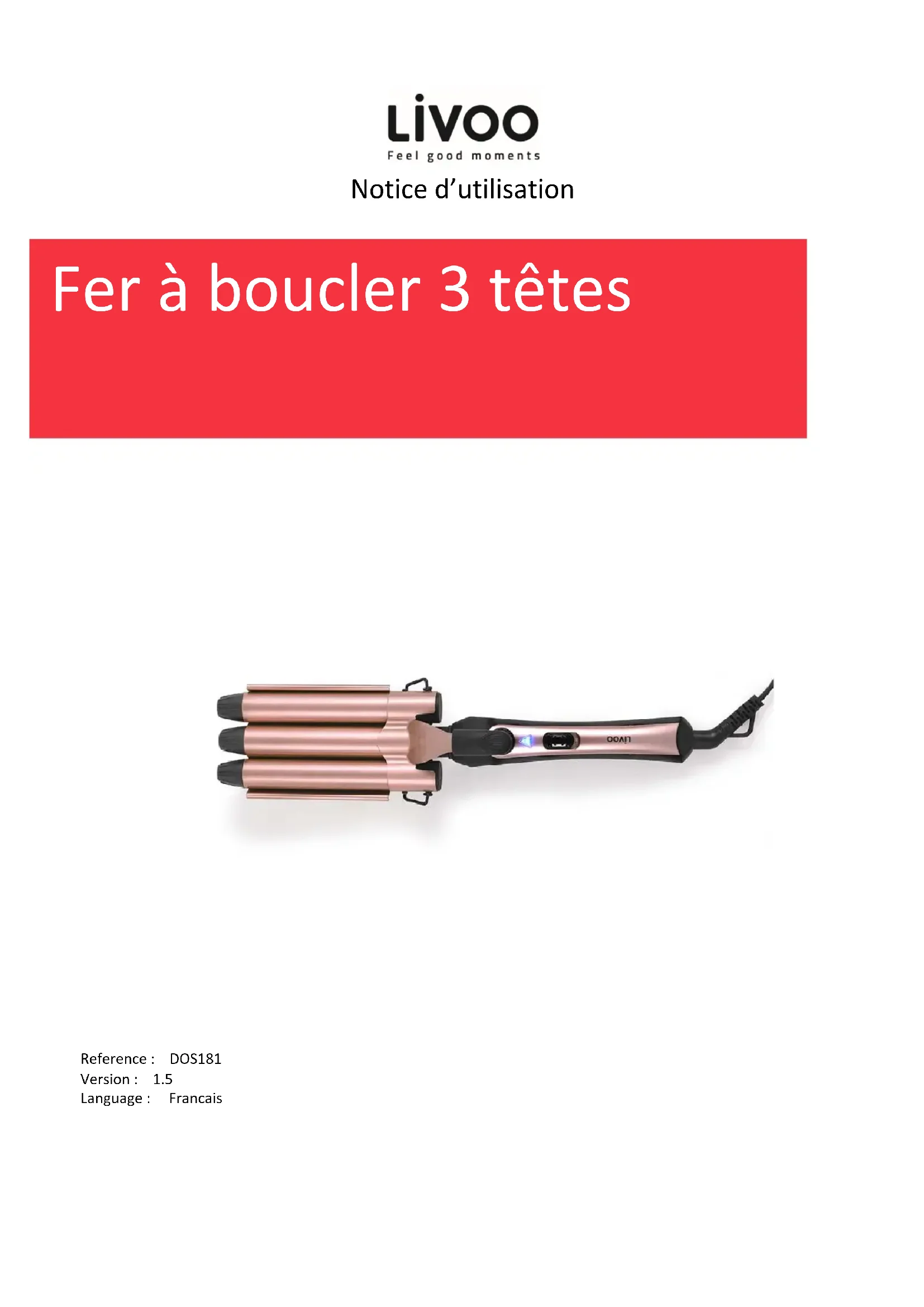 Fer à boucler 3 têtesNotice d’utilisation Vous avez acheté un produit de la marque LIVOO et nous vous en remercions. Nous apportons un grand soin au design, à l'ergonomie et à la facilité d'utilisation de nos produits. Nous espérons que ce produit vous donnera entière satisfaction.