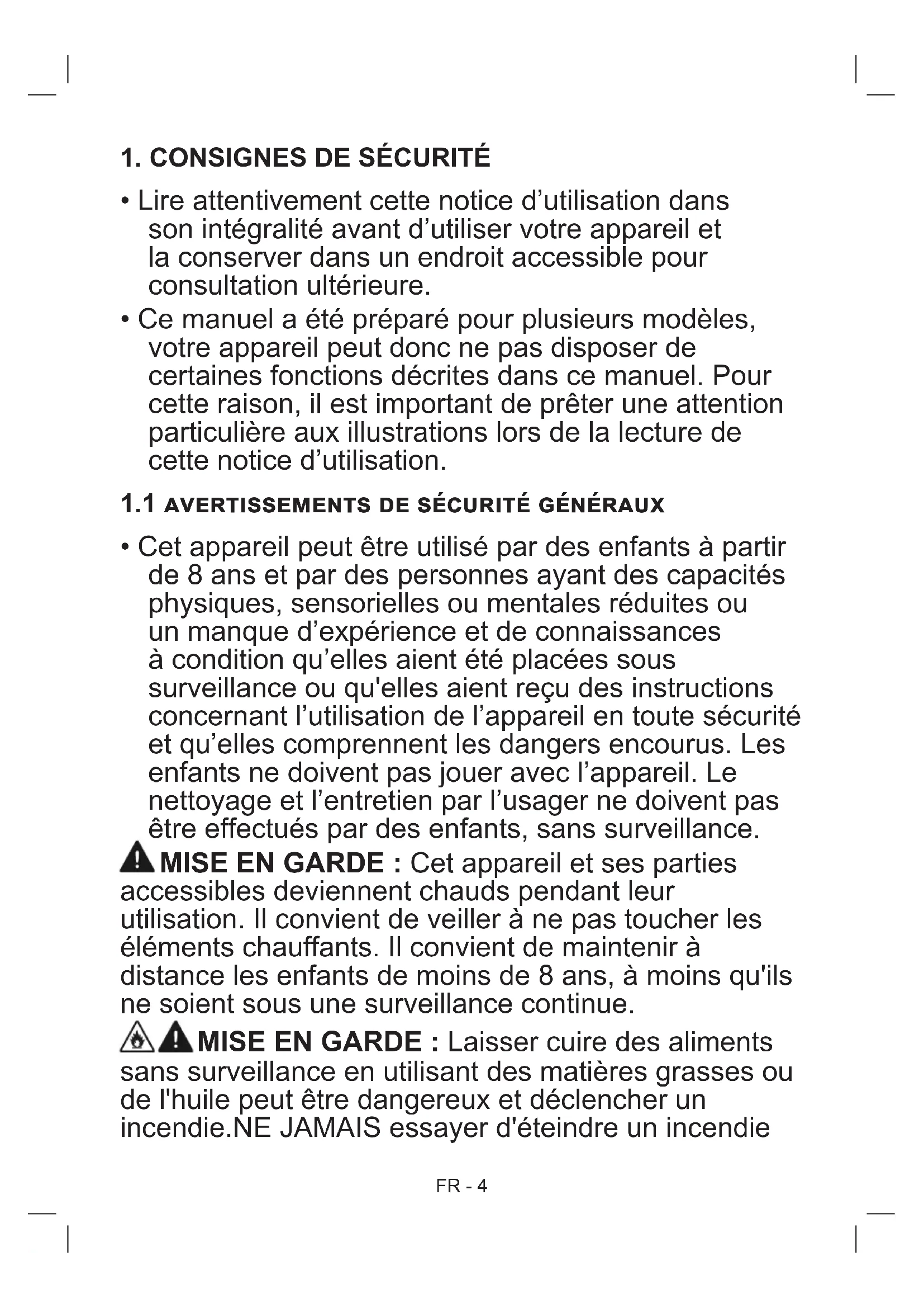 - Cet appareil peut être utilisé par des enfants à partir de 8 ans et par des personnes ayant des capacités physiques, sensorielles ou mentales réduites ou un manque d’expérience et de connaissances à condition qu’elles aient été placées sous surveillance ou qu'elles aient reçu des instructions concernant l’utilisation de l’appareil en toute sécurité et qu’elles comprennent les dangers encourus. Les enfants ne doivent pas jouer avec l’appareil. Le nettoyage et l’entretien par l’usager ne doivent pas être effectués par des enfants, sans surveillance. MISE EN GARDE : Cet appareil et ses parties accessibles deviennent chauds pendant leur utilisation. Il convient de veiller à ne pas toucher les éléments chauffants. Il convient de maintenir à distance les enfants de moins de 8 ans, à moins qu'ils ne soient sous une surveillance continue. MISE EN GARDE : Laisser cuire des aliments sans surveillance en utilisant des matières grasses ou de l'huile peut être dangereux et déclencher un incendie.NE JAMAIS essayer d'éteindre un incendieFR - 5 avec de l'eau, mais arrêter l'appareil puis couvrir les flammes par exemple avec un couvercle ou une couverture anti-feu. MISE EN GARDE : Risque d'incendie: ne pas entreposer d'objets sur les surfaces de cuisson.