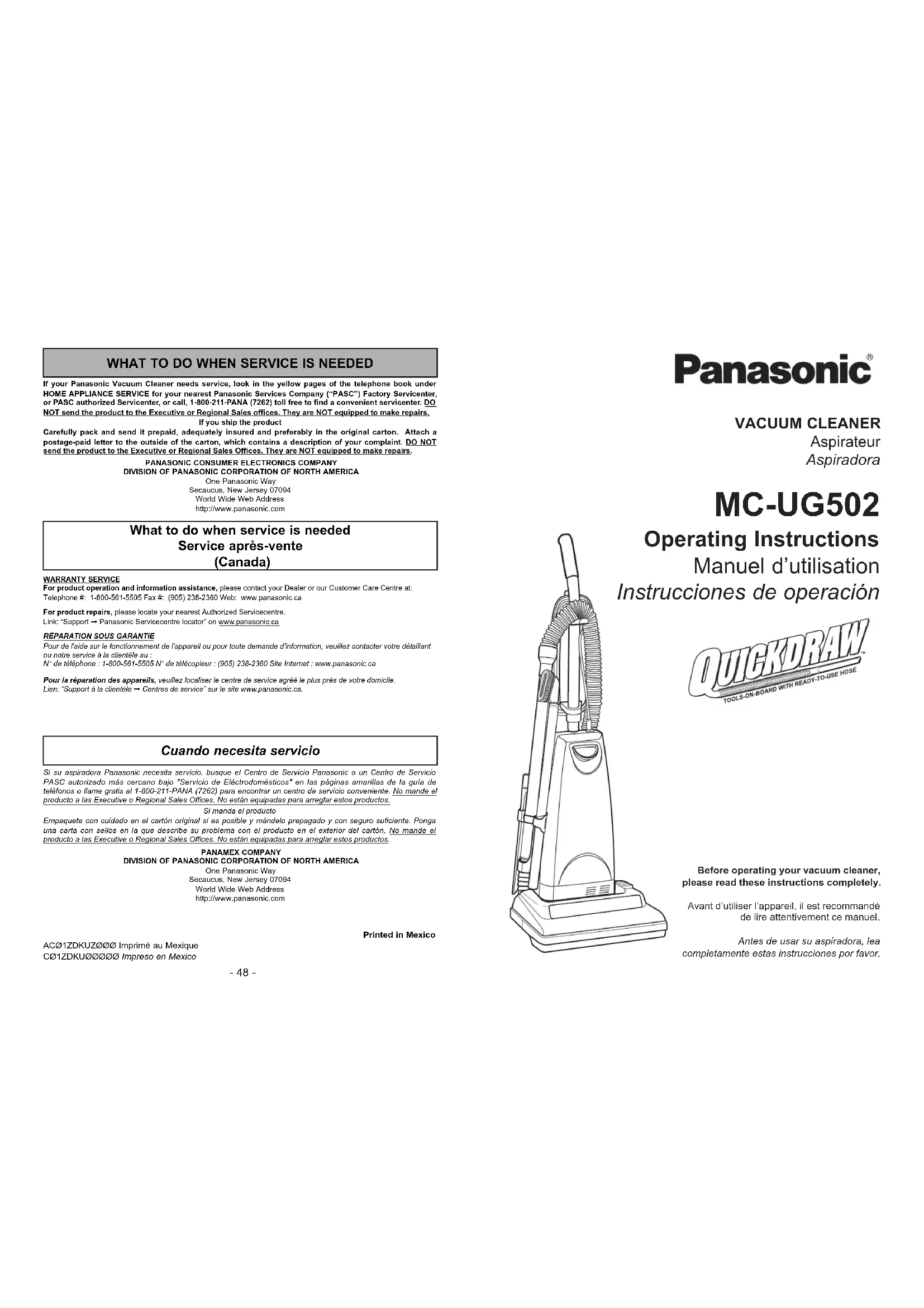MCUG502 - Aspirateur PANASONIC - Notice d'utilisation et mode d'emploi gratuit