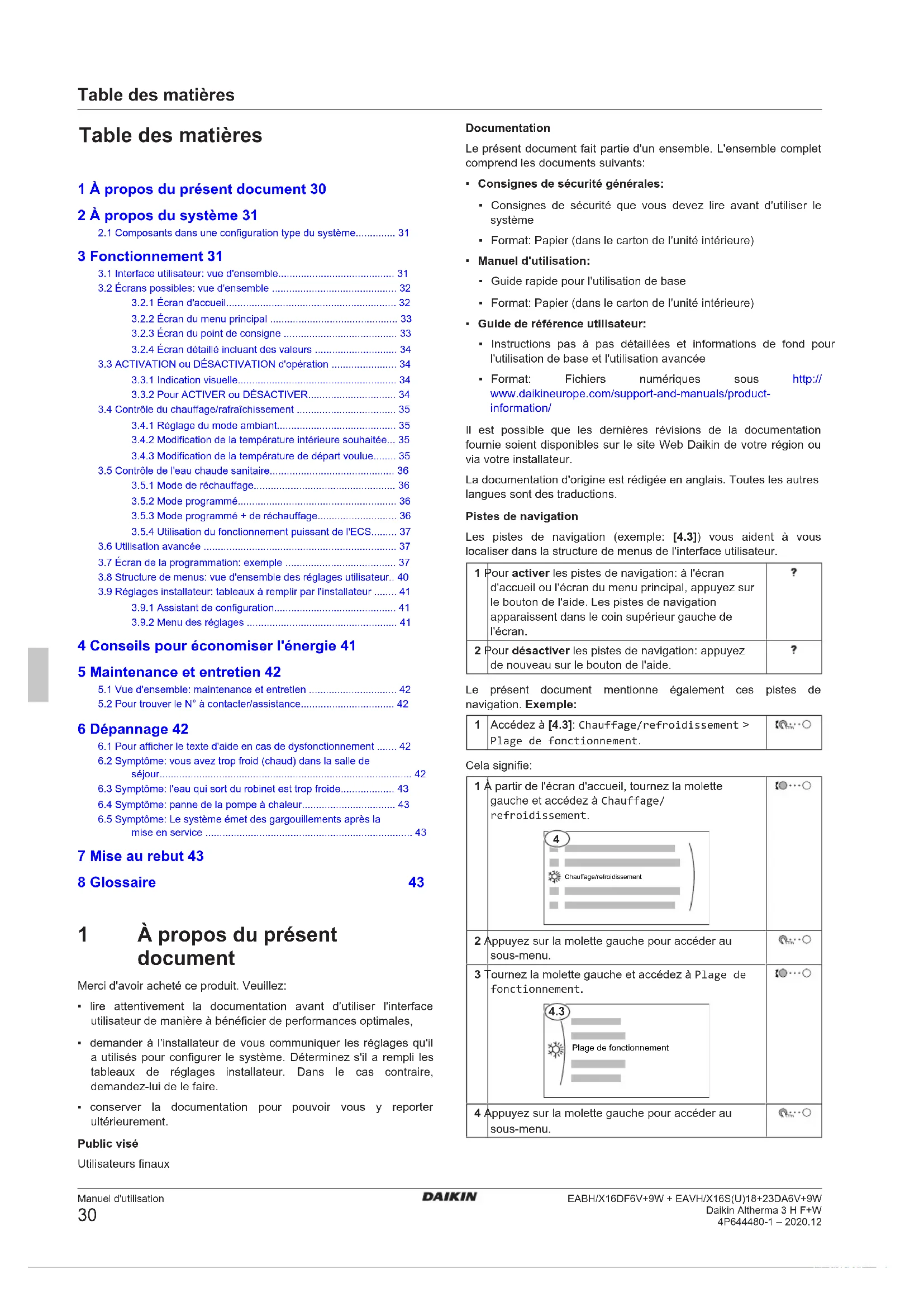 - Format: Fichiers numériques sous http:// www.daikineurope.com/support-and-manuals/product- information/ Il est possible que les dernières révisions de la documentation fournie soient disponibles sur le site Web Daikin de votre région ou via votre installateur. La documentation d'origine est rédigée en anglais. Toutes les autres langues sont des traductions. Pistes de navigation Les pistes de navigation (exemple: [4.3]) vous aident à vous localiser dans la structure de menus de l'interface utilisateur. 1 Pour activer les pistes de navigation: à l'écran d'accueil ou l'écran du menu principal, appuyez sur le bouton de l'aide. Les pistes de navigation apparaissent dans le coin supérieur gauche de l'écran. 2 Pour désactiver les pistes de navigation: appuyez de nouveau sur le bouton de l'aide. Le présent document mentionne également ces pistes de navigation. Exemple: 1 Accédez à [4.3]: Chauffage/refroidissement > Plage de fonctionnement. Cela signifie: 1 À partir de l'écran d'accueil, tournez la molette gauche et accédez à Chauffage/ refroidissement.