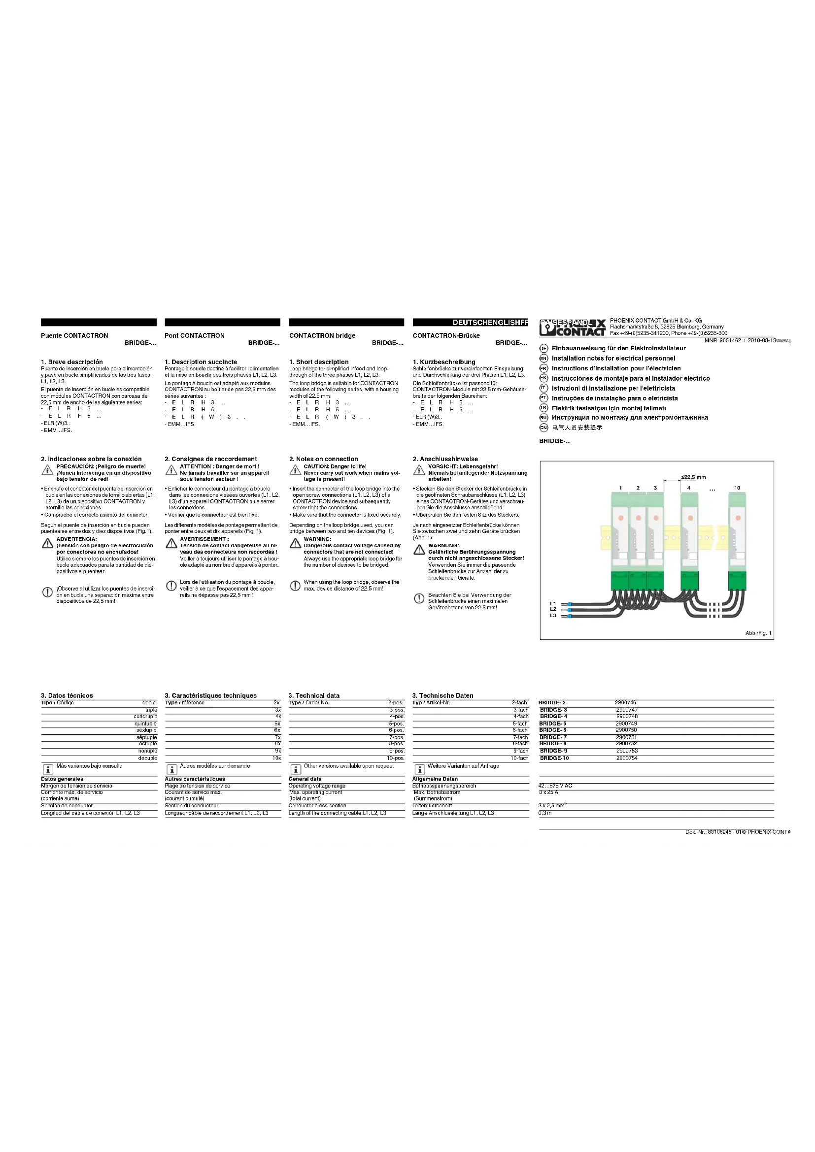 Tension de contact dangereuse au ni- veau des connecteurs non raccordés ! Veiller à toujours utiliser le pontage à bou- cle adapté au nombre d'appareils à ponter. Lors de l'utilisation du pontage à boucle, veiller à ce que l'espacement des appa- reils ne dépasse pas 22,5 mm ! BRIDGE-... Puente CONTACTRON BRIDGE-...