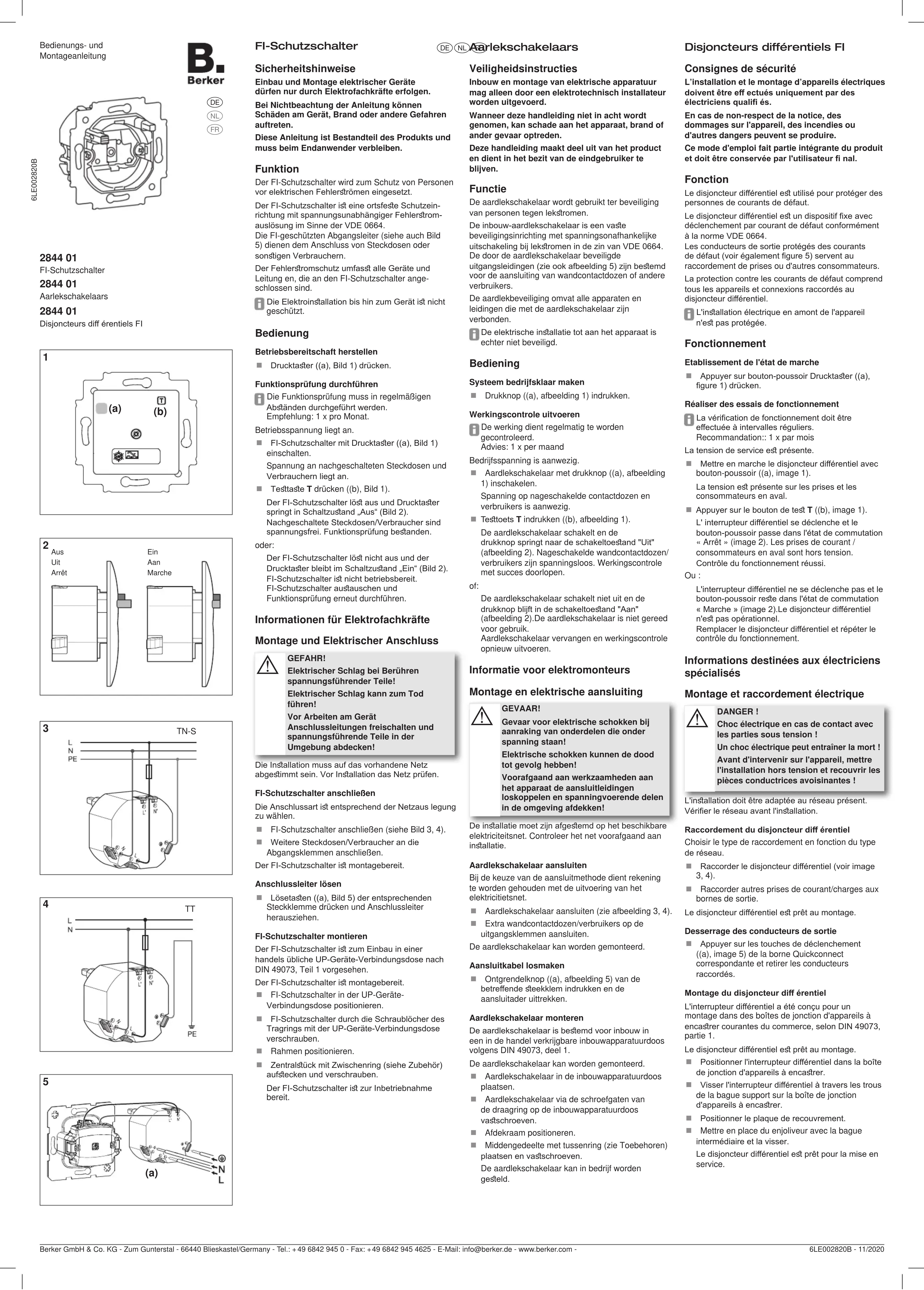 De installatie moet zijn afgestemd op het beschikbare elektriciteitsnet. Controleer het net voorafgaand aan installatie. Aardlekschakelaar aansluiten Bij de keuze van de aansluitmethode dient rekening te worden gehouden met de uitvoering van het elektricitietsnet. Aardlekschakelaar aansluiten (zie afbeelding 3, 4). Extra wandcontactdozen/verbruikers op de uitgangsklemmen aansluiten. De aardlekschakelaar kan worden gemonteerd. Aansluitkabel losmaken Ontgrendelknop ((a), afbeelding 5) van de betreffende steekklem indrukken en de aansluitader uittrekken. Aardlekschakelaar monteren De aardlekschakelaar is bestemd voor inbouw in een in de handel verkrijgbare inbouwapparatuurdoos volgens DIN 49073, deel 1. De aardlekschakelaar kan worden gemonteerd. Aardlekschakelaar in de inbouwapparatuurdoos plaatsen. Aardlekschakelaar via de schroefgaten van de draagring op de inbouwapparatuurdoos vastschroeven. Afdekraam positioneren. Middengedeelte met tussenring (zie Toebehoren) plaatsen en vastschroeven. De aardlekschakelaar kan in bedrijf worden gesteld. Disjoncteurs différentiels FI Consignes de sécurité L’installation et le montage d’appareils électriques doivent être eff ectués uniquement par des électriciens qualifi és. En cas de non-respect de la notice, des dommages sur l'appareil, des incendies ou d'autres dangers peuvent se produire. Ce mode d'emploi fait partie intégrante du produit et doit être conservée par l'utilisateur fi nal. Fonction Le disjoncteur différentiel est utilisé pour protéger des personnes de courants de défaut. Le disjoncteur différentiel est un dispositif fixe avec déclenchement par courant de défaut conformément à la norme VDE 0664. Les conducteurs de sortie protégés des courants de défaut (voir également figure 5) servent au raccordement de prises ou d'autres consommateurs. La protection contre les courants de défaut comprend tous les appareils et connexions raccordés au disjoncteur différentiel. L'installation électrique en amont de l'appareil n'est pas protégée. Fonctionnement Etablissement de l'état de marche Appuyer sur bouton-poussoir Drucktaster ((a), figure 1) drücken. Réaliser des essais de fonctionnement La vérification de fonctionnement doit être effectuée à intervalles réguliers. Recommandation:: 1 x par mois La tension de service est présente. Mettre en marche le disjoncteur différentiel avec bouton-poussoir ((a), image 1). La tension est présente sur les prises et les consommateurs en aval. Appuyer sur le bouton de test T ((b), image 1). L' interrupteur différentiel se déclenche et le bouton-poussoir passe dans l'état de commutation « Arrêt » (image 2). Les prises de courant / consommateurs en aval sont hors tension. Contrôle du fonctionnement réussi. Ou : L'interrupteur différentiel ne se déclenche pas et le bouton-poussoir reste dans l'état de commutation « Marche » (image 2).Le disjoncteur différentiel n'est pas opérationnel. Remplacer le disjoncteur différentiel et répéter le contrôle du fonctionnement. Informations destinées aux électriciens spécialisés Montage et raccordement électrique DANGER ! Choc électrique en cas de contact avec les parties sous tension ! Un choc électrique peut entraîner la mort ! Avant d'intervenir sur l'appareil, mettre l'installation hors tension et recouvrir les pièces conductrices avoisinantes !