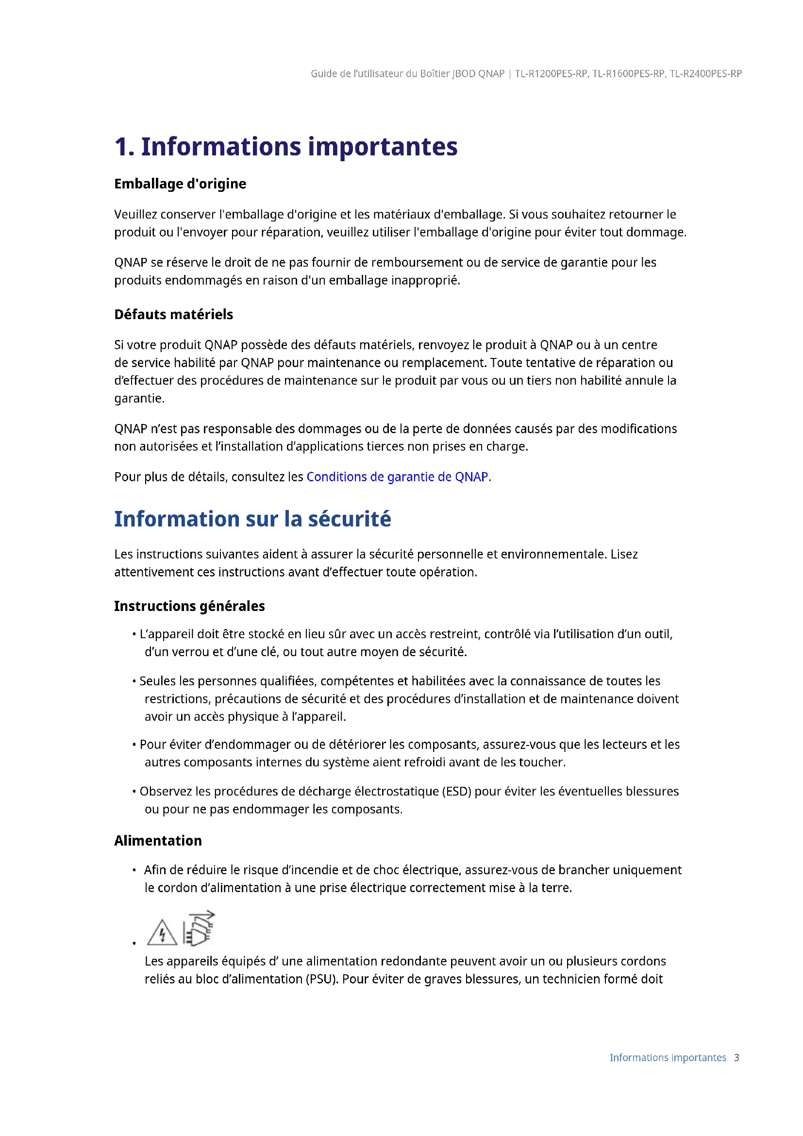 Emballage d'origine Veuillez conserver l'emballage d'origine et les matériaux d'emballage. Si vous souhaitez retourner le produit ou l'envoyer pour réparation, veuillez utiliser l'emballage d'origine pour éviter tout dommage. QNAP se réserve le droit de ne pas fournir de remboursement ou de service de garantie pour les produits endommagés en raison d'un emballage inapproprié. Défauts matériels Si votre produit QNAP possède des défauts matériels, renvoyez le produit à QNAP ou à un centre de service habilité par QNAP pour maintenance ou remplacement. Toute tentative de réparation ou d’eectuer des procédures de maintenance sur le produit par vous ou un tiers non habilité annule la garantie. QNAP n’est pas responsable des dommages ou de la perte de données causés par des modications non autorisées et l’installation d’applications tierces non prises en charge. Pour plus de détails, consultez les Conditions de garantie de QNAP. Information sur la sécurité Les instructions suivantes aident à assurer la sécurité personnelle et environnementale. Lisez attentivement ces instructions avant d’eectuer toute opération. Instructions générales