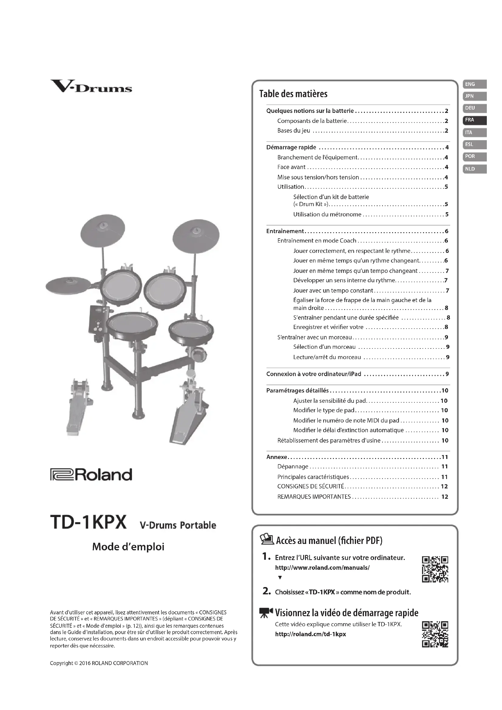 Visionnez la vidéo de démarrage rapide Cette vidéo explique comme utiliser le TD-1KPX. http://roland.cm/td-1kpx Copyright © 2016 ROLAND CORPORATION Mode d’emploi Avant d’utiliser cet appareil, lisez attentivement les documents «CONSIGNES DE SÉCURITÉ» et «REMARQUES IMPORTANTES» (dépliant «CONSIGNES DE SÉCURITÉ» et «Mode d’emploi» (p. 12)), ainsi que les remarques contenues dans le Guide d’installation, pour être sûr d’utiliser le produit correctement. Après lecture, conservez les documents dans un endroit accessible pour pouvoir vous y reporter dès que nécessaire.2 Quelques notions sur la batterie Grosse caisse/pédale de grosse caisse Jouée avec une pédale de grosse caisse, la grosse caisse est le plus gros composant de la batterie.* Utilisez une pédale de grosse caisse disponible dans le commerce. Caisse claire La caisse claire est la «voix» de la batterie. Charleston/pédale de charleston Un charleston acoustique utilise 2cymbales montées sur un pied de charleston. La pédale l’ouvre et le ferme.* La batterie TD-1KPX utilise un seul pad. Tom (Tom 1, Tom 2) Ils se trouvent généralement au-dessus de la grosse caisse. Floor tom (Tom 3) Parfois appelé tom de basse, il repose sur ses pieds ou est monté sur un support. Cymbale ride Généralement montée à droite de la batterie, la cymbale ride est un des principaux éléments de tenue du tempo. Cymbale crash Plus petite que la cymbale ride, elle s’utilise essentiellement pour accentuer le jeu. Composants de la batterie Termes utilisés pour jouer de la batterie. Batterie acoustique CharlestonCymbale rideCaisse claire Tom Floor tomPédale de charlestonGrosse caissePédale de grosse caisseCymbale crash TD-1KPX CharlestonCymbale rideCaisse claireTom 1Pédale de charlestonPédale de grosse caisseCymbale crashTom 2Tom 3Module de sons de batterie Bases du jeu La batterie se joue avec les deux mains et les deux pieds.Nous allons expliquer comment tenir les baguettes et utiliser les pédales. Tenue des baguettes La tenue la plus répandue des baguettes est baptisée «prisetimbale» (matched grip) - voir les illustrations ci-dessous. Main gauche Main droite Utilisation de la pédale de grosse caisse Il existe deuxfaçons d’appuyer sur la pédale de grosse caisse: «talon levé» ou «talon baissé». Talon levé Dans cette méthode, votre talon otte au-dessus de la pédale. Lorsque le pied ne repose pas sur la pédale, abaissez-le complètement pour appuyer sur la pédale.Cette méthode applique le poids total de la jambe sur la pédale et permet de produire des sons plus forts qu’avec la méthode du talon baissé. Elle est souvent utilisée en rock et pop. Talon baissé Dans cette méthode, toute la plante du pied du talon aux orteils reste en contact avec la pédale. Utilisez votre cheville pour que vos orteils actionnent la pédale. Cette méthode contrôle plus précisément le volume et est souvent utilisée en jazz et bossa nova.Quelques notions sur la batterie