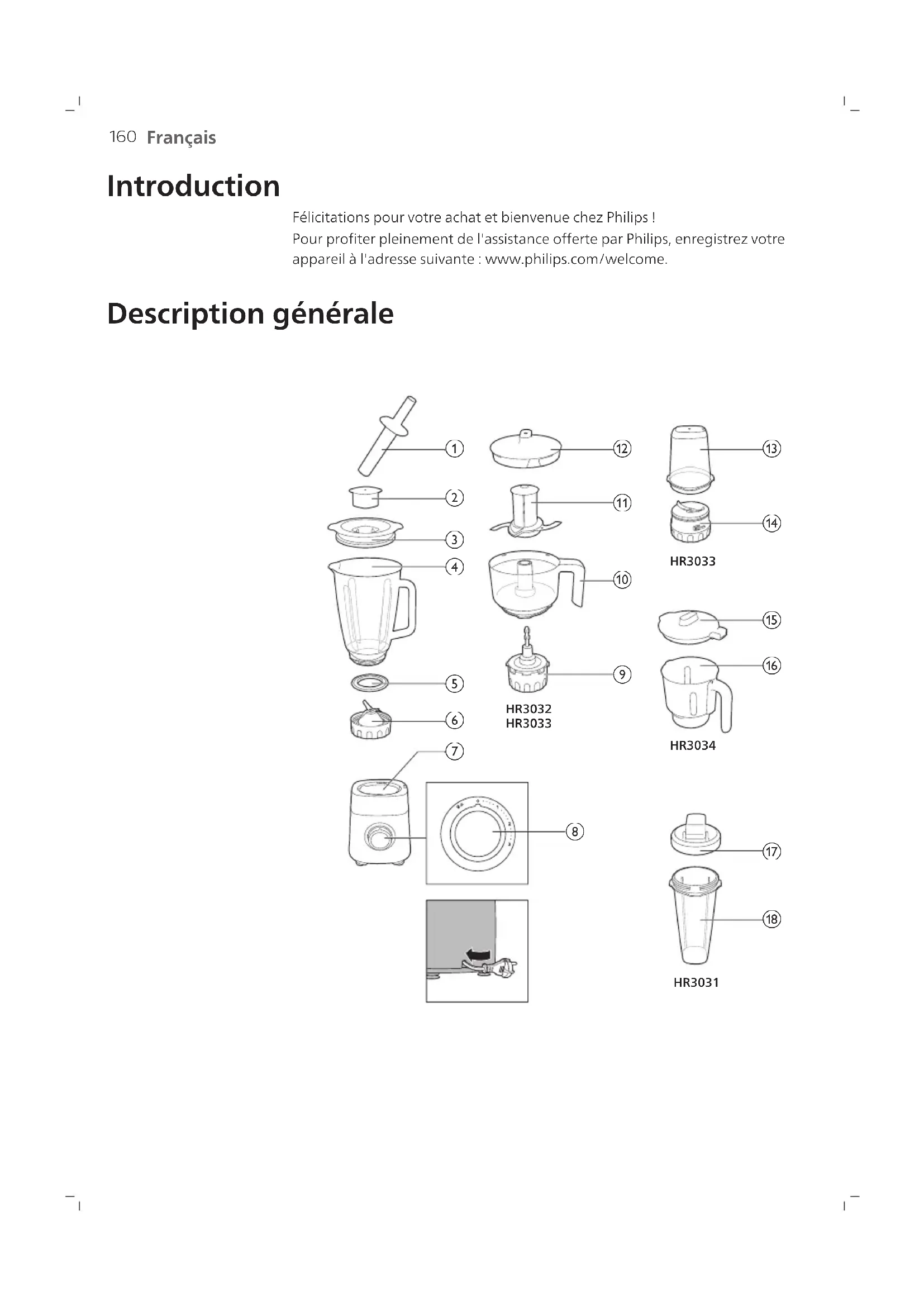 Français Introduction Félicitations pour votre achat et bienvenue chez Philips! Pour profiter pleinement de l'assistance offerte par Philips, enregistrez votre appareil à l'adresse suivante: www.philips.com/welcome. Description générale HR3034HR3031 HR3033HR3032 HR3033