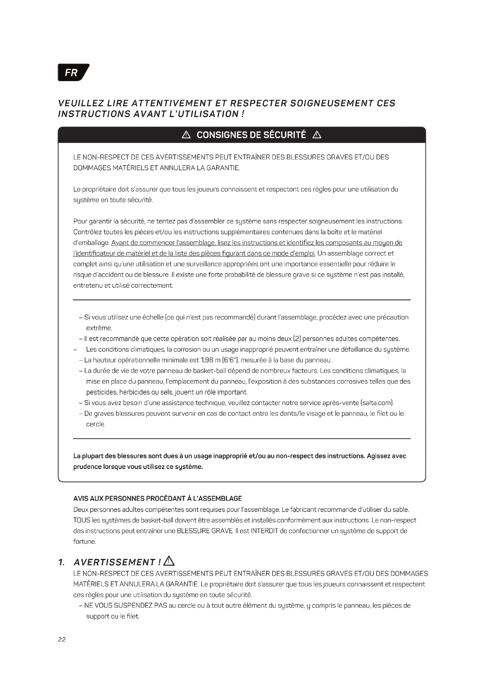 LE NON-RESPECT DE CES AVERTISSEMENTS PEUT ENTRAÎNER DES BLESSURES GRAVES ET/OU DES DOMMAGES MATÉRIELS ET ANNULERA LA GARANTIE. Le propriétaire doit s’assurer que tous les joueurs connaissent et respectent ces règles pour une utilisation du système en toute sécurité. Pour garantir la sécurité, ne tentez pas d’assembler ce système sans respecter soigneusement les instructions. Contrôlez toutes les pièces et/ou les instructions supplémentaires contenues dans la boîte et le matériel d’emballage. Avant de commencer l’assemblage, lisez les instructions et identifiez les composants au moyen de l’identificateur de matériel et de la liste des pièces figurant dans ce mode d’emploi. Un assemblage correct et complet ainsi qu’une utilisation et une surveillance appropriées ont une importance essentielle pour réduire le risque d’accident ou de blessure. Il existe une forte probabilité de blessure grave si ce système n’est pas installé, entretenu et utilisé correctement. – Si vous utilisez une échelle (ce qui n’est pas recommandé) durant l’assemblage, procédez avec une précaution extrême. – Il est recommandé que cette opération soit réalisée par au moins deux (2) personnes adultes compétentes. – Les conditions climatiques, la corrosion ou un usage inapproprié peuvent entraîner une défaillance du système. – La hauteur opérationnelle minimale est 1,98 m (6’6”), mesurée à la base du panneau. – La durée de vie de votre panneau de basket-ball dépend de nombreux facteurs. Les conditions climatiques, la mise en place du panneau, l’emplacement du panneau, l’exposition à des substances corrosives telles que des pesticides, herbicides ou sels, jouent un rôle important. – Si vous avez besoin d’une assistance technique, veuillez contacter notre service après-vente (salta.com). – De graves blessures peuvent survenir en cas de contact entre les dents/le visage et le panneau, le filet ou le cercle. La plupart des blessures sont dues à un usage inapproprié et/ou au non-respect des instructions. Agissez avec prudence lorsque vous utilisez ce système. AVIS AUX PERSONNES PROCÉDANT À L’ASSEMBLAGE Deux personnes adultes compétentes sont requises pour l’assemblage. Le fabricant recommande d’utiliser du sable. TOUS les systèmes de basket-ball doivent être assemblés et installés conformément aux instructions. Le non-respect des instructions peut entraîner une BLESSURE GRAVE. Il est INTERDIT de confectionner un système de support de fortune. !23