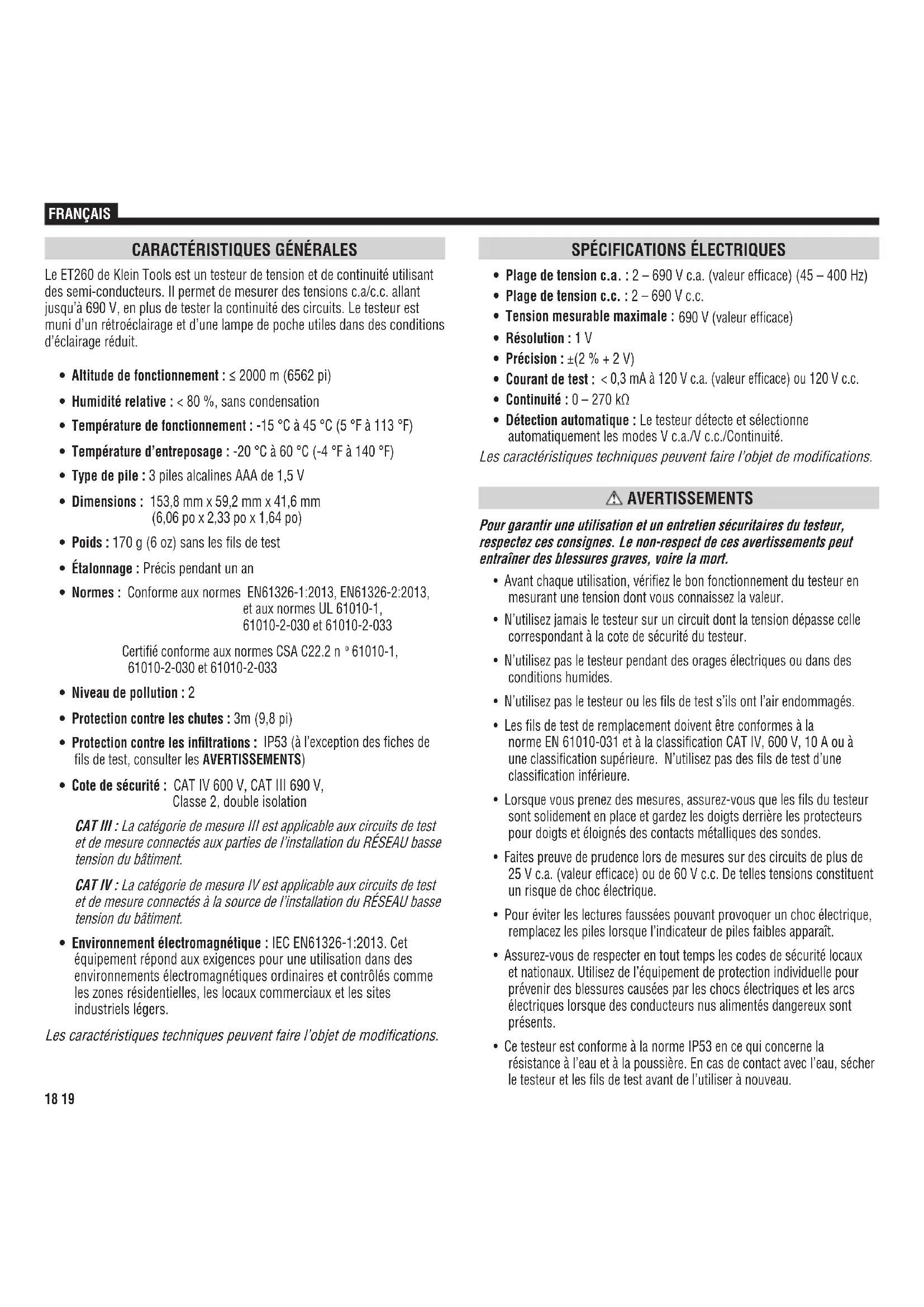 à l’aide des vis. Pour éviter tout risque de choc électrique, déconnectez les ls de la source de tension avant de retirer la porte du compartiment à piles. Pour éviter tout risque de choc électrique, n’utilisez pas le testeur lorsque la porte du compartiment à piles est retirée. REMARQUE: Ce testeur ne contient aucune pièce réparable par l’utilisateur. 5/32 po 0,7 po (18 mm)1390193 Rev 06/17 A FRANÇAIS NETTOYAGE Débranchez les fils de test. Nettoyez l’appareil à l’aide d’un chiffon humide. N’utilisez pas de nettoyant abrasif ou de solvant. ENTREPOSAGE N’exposez pas l’appareil à des températures ou à un taux d’humidité élevés. Après l’avoir rangé dans des conditions extrêmes qui dépassent les limites mentionnées dans la section Caractéristiques générales, laissez l’appareil revenir à des conditions d’utilisation normales avant de l’utiliser. GARANTIE www.kleintools.com/warranty
