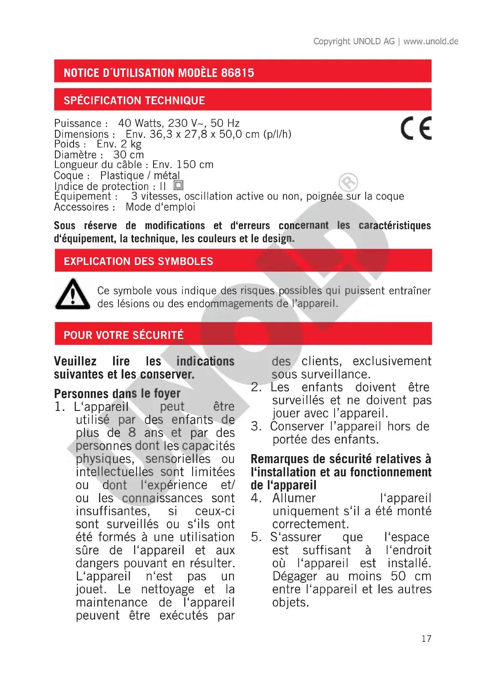 Silverline 86815 - Ventilateur UNOLD - Notice d'utilisation et mode d'emploi gratuit