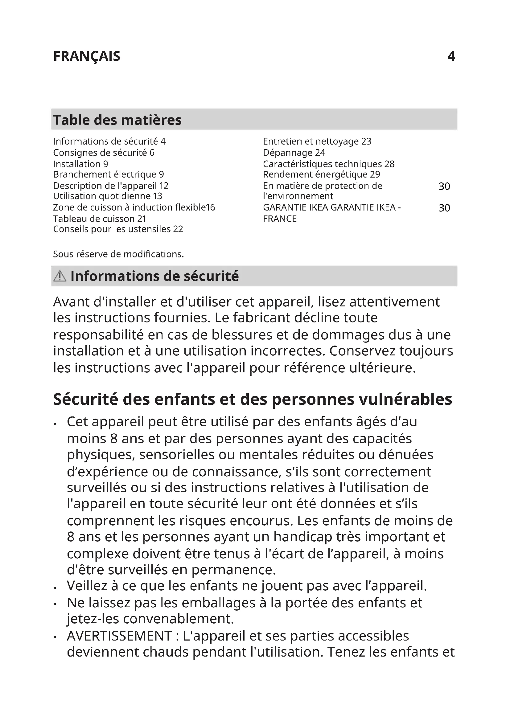 HÖGKLASSIG fr itFRANÇAIS Vous trouverez la liste complète des centres de service après-vente choisis par IKEA et leurs numéros de téléphone respectifs à la n de cette notice. ITALIANO Consultare l'elenco completo dei Centri di Assistenza nominati da IKEA e dei relativi numeri di telefono nell'ultima pagina del presente manuale.FRANÇAIS 4 ITALIANO 39Table des matières Informations de sécurité 4 Consignes de sécurité 6 Installation 9 Branchement électrique 9 Description de l'appareil 12 Utilisation quotidienne 13 Zone de cuisson à induction exible 16 Tableau de cuisson 21 Conseils pour les ustensiles 22 Entretien et nettoyage 23 Dépannage 24 Caractéristiques techniques 28 Rendement énergétique 29 En matière de protection de l'environnement