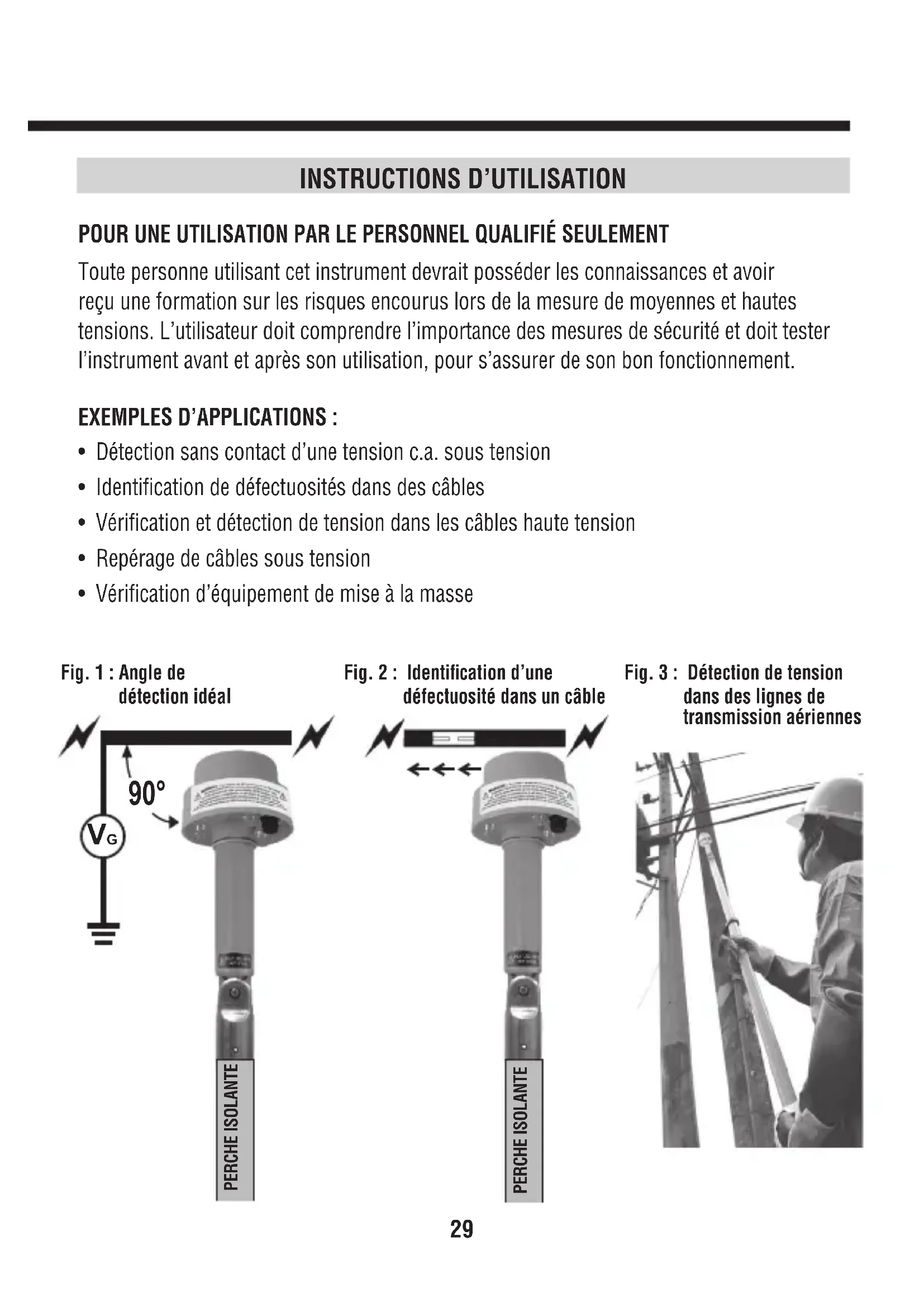 POUR UNE UTILISATION PAR LE PERSONNEL QUALIFIÉ SEULEMENT Toute personne utilisant cet instrument devrait posséder les connaissances et avoir reçu une formation sur les risques encourus lors de la mesure de moyennes et hautes tensions. L’utilisateur doit comprendre l’importance des mesures de sécurité et doit tester l’instrument avant et après son utilisation, pour s’assurer de son bon fonctionnement. EXEMPLES D’APPLICATIONS: