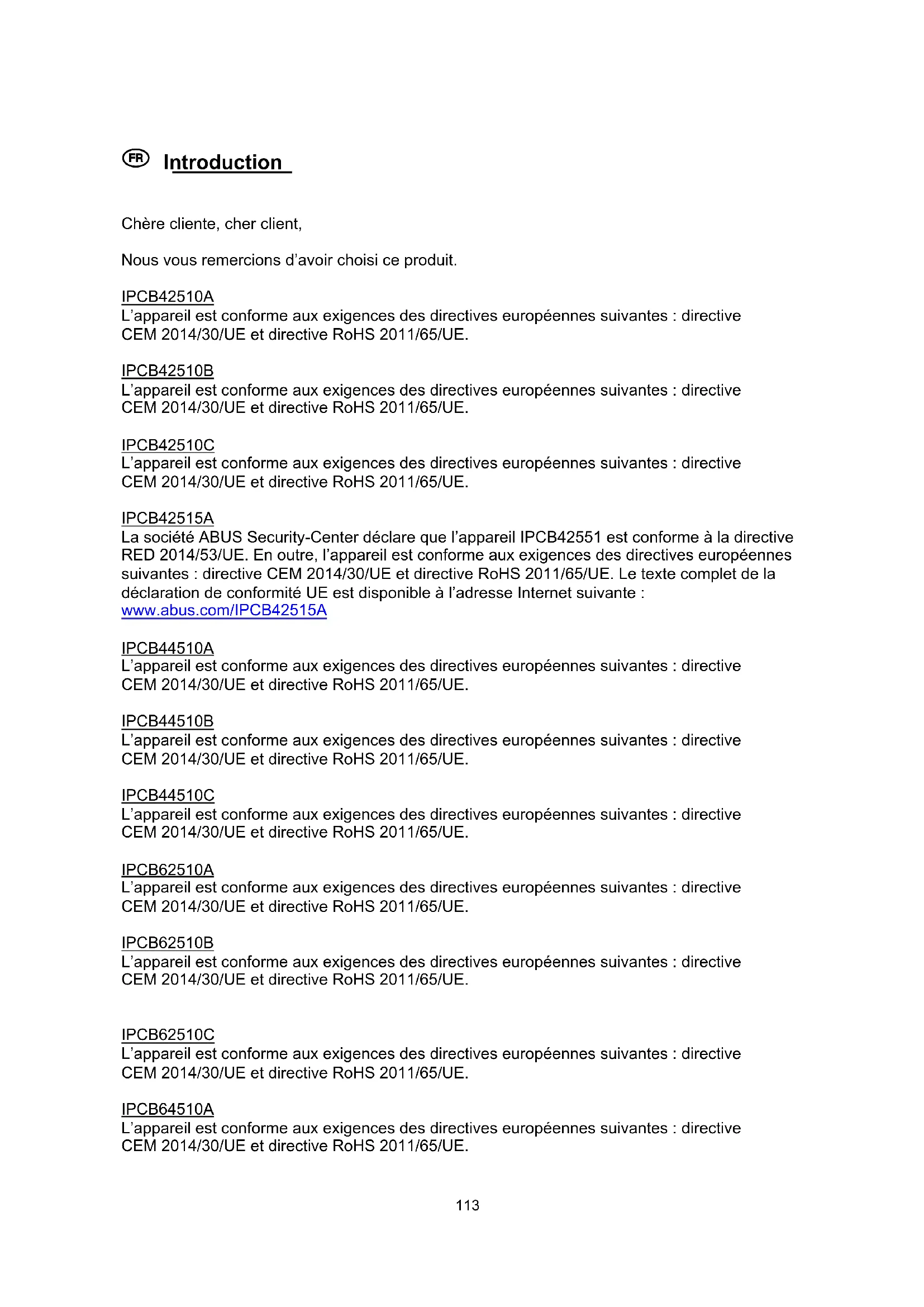 Chère cliente, cher client, Nous vous remercions d’avoir choisi ce produit. IPCB42510A L’appareil est conforme aux exigences des directives européennes suivantes : directive CEM 2014/30/UE et directive RoHS 2011/65/UE. IPCB42510B L’appareil est conforme aux exigences des directives européennes suivantes : directive CEM 2014/30/UE et directive RoHS 2011/65/UE. IPCB42510C L’appareil est conforme aux exigences des directives européennes suivantes : directive CEM 2014/30/UE et directive RoHS 2011/65/UE. IPCB42515A La société ABUS Security-Center déclare que l’appareil IPCB42551 est conforme à la directive RED 2014/53/UE. En outre, l’appareil est conforme aux exigences des directives européennes suivantes : directive CEM 2014/30/UE et directive RoHS 2011/65/UE. Le texte complet de la déclaration de conformité UE est disponible à l’adresse Internet suivante : www.abus.com/IPCB42515A IPCB44510A L’appareil est conforme aux exigences des directives européennes suivantes : directive CEM 2014/30/UE et directive RoHS 2011/65/UE. IPCB44510B L’appareil est conforme aux exigences des directives européennes suivantes : directive CEM 2014/30/UE et directive RoHS 2011/65/UE. IPCB44510C L’appareil est conforme aux exigences des directives européennes suivantes : directive CEM 2014/30/UE et directive RoHS 2011/65/UE. IPCB62510A L’appareil est conforme aux exigences des directives européennes suivantes : directive CEM 2014/30/UE et directive RoHS 2011/65/UE. IPCB62510B L’appareil est conforme aux exigences des directives européennes suivantes : directive CEM 2014/30/UE et directive RoHS 2011/65/UE.