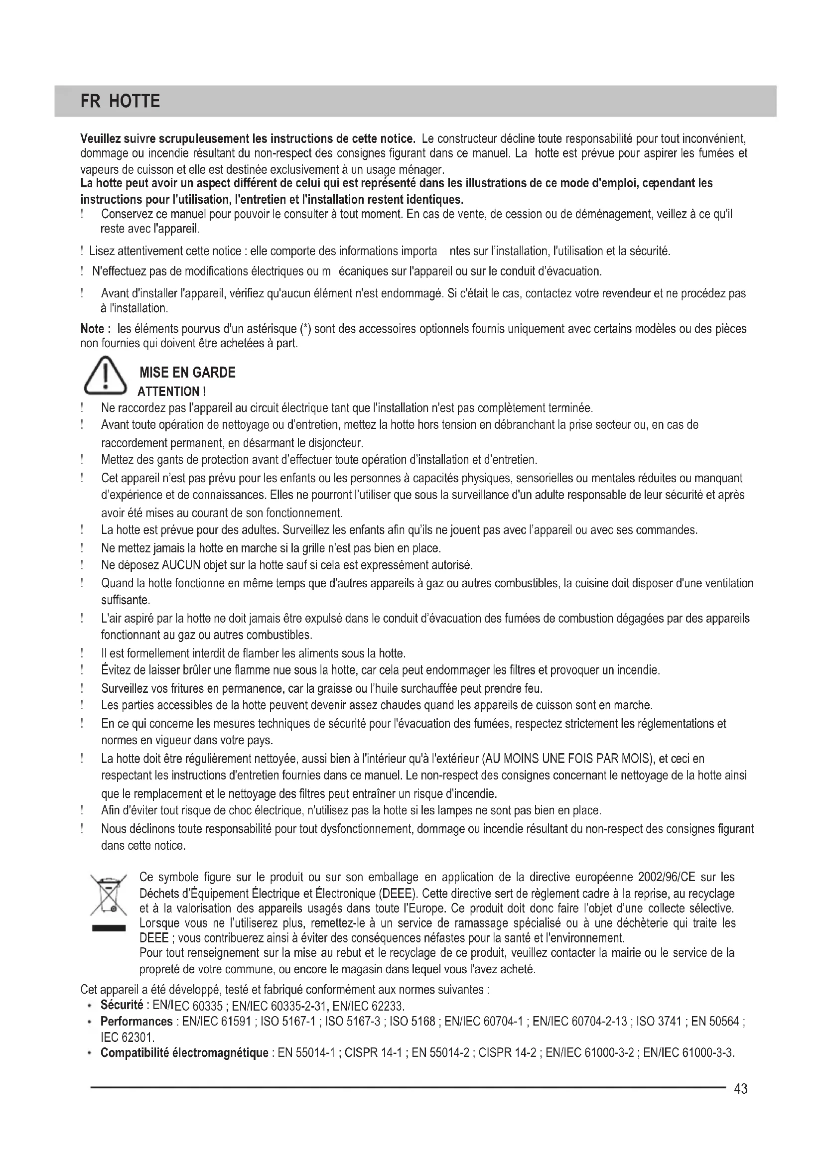 ATTENTION ! ! Ne raccordez pas l’appareil au circuit électrique tant que l'installation n'est pas complètement terminée. ! Avant toute opération de nettoyage ou d’entretien, mettez la hotte hors tension en débranchant la prise secteur ou, en cas de raccordement permanent, en désarmant le disjoncteur. ! Mettez des gants de protection avant d’effectuer toute opération d’installation et d’entretien. ! Cet appareil n’est pas prévu pour les enfants ou les personnes à capacités physiques, sensorielles ou mentales réduites ou manquant d’expérience et de connaissances. Elles ne pourront l’utiliser que sous la surveillance d'un adulte responsable de leur sécurité et après avoir été mises au courant de son fonctionnement. ! La hotte est prévue pour des adultes. Surveillez les enfants afin qu’ils ne jouent pas avec l’appareil ou avec ses commandes. ! Ne mettez jamais la hotte en marche si la grille n'est pas bien en place. ! Ne déposez AUCUN objet sur la hotte sauf si cela est expressément autorisé. ! Quand la hotte fonctionne en même temps que d'autres appareils à gaz ou autres combustibles, la cuisine doit disposer d'une ventilation suffisante. ! L'air aspiré par la hotte ne doit jamais être expulsé dans le conduit d’évacuation des fumées de combustion dégagées par des appareils fonctionnant au gaz ou autres combustibles. ! Il est formellement interdit de flamber les aliments sous la hotte. ! Évitez de laisser brûler une flamme nue sous la hotte, car cela peut endommager les filtres et provoquer un incendie. ! Surveillez vos fritures en permanence, car la graisse ou l’huile surchauffée peut prendre feu. ! Les parties accessibles de la hotte peuvent devenir assez chaudes quand les appareils de cuisson sont en marche. ! En ce qui concerne les mesures techniques de sécurité pour l'évacuation des fumées, respectez strictement les réglementations et normes en vigueur dans votre pays. ! La hotte doit être régulièrement nettoyée, aussi bien à l'intérieur qu'à l'exté rieur (AU MOINS UNE FOIS PAR MOIS), et ceci en respectant les instructions d'entretien fournies dans ce manuel. Le non-respect des consignes concernant le nettoyage de la hotte ainsi que le remplacement et le nettoyage des filtres peut entraîner un risque d'incendie. ! Afin d'éviter tout risque de choc électrique, n'utilisez pas la hotte si les lampes ne sont pas bien en place. ! Nous déclinons toute responsabilité pour tout dysfonctionnement, dommage ou incendie résultant du non-respect des consignes figurant dans cette notice. Ce symbole figure sur le produit ou sur son emballage en application de la directive européenne 2002/96/CE sur les Déchets d’Équipement Électrique et Électronique (DEEE). Cette directive sert de règlement cadre à la reprise, au recyclage et à la valorisation des appareils usagés dans toute l’Europe. Ce produit doit donc faire l’objet d’une collecte sélective. Lor sque vous ne l’utiliserez plus, remettez-le à un service de ramassage spécialisé ou à une déchèterie qui traite les DEEE ; vous contribuerez ainsi à éviter des conséquences néfastes pour la santé et l'environnement. Pour tout renseignement sur la mise au rebut et le recyclage de ce produit, veuillez contacter la mairie ou le service de la propreté de votre commune, ou encore le magasin dans lequel vous l'avez acheté. Cet appareil a été développé, testé et fabriqué conformément aux normes suivantes : Sécurité : EN/I EC 60335 ; EN/IEC 60335-2-31, EN/IEC 62233. Performances : EN/IEC 61591 ; ISO 5167-1 ; ISO 5167-3 ; ISO 5168 ; EN/IEC 60704-1 ; EN/IEC 60704-2-13 ; ISO 3741 ; EN 50564 ; IEC 62301. Compatibilité électromagnétique : EN 55014-1 ; CISPR 14-1 ; EN 55014-2 ; CISPR 14-2 ; EN/IEC 61000-3-2 ; EN/IEC 61000-3-3.44 Suggestions pour une utilisation correcte afin de réduire l'impact sur l'environnement : mettez la hotte en MARCHE à la vitesse minimale lorsque vous commencez à cuisiner et laissez-la fonctionner quelques minutes après la fin de la cuisson. Augmentez la vitesse uniquement en cas de fumée et de vapeur importantes et n'utilisez la fonction booster que dans des situations extrêmes. Remplacez le ou les filtre(s) à charbon quand cela est néces saire pour que les odeurs soient éliminées. Nettoyez le(s) filtre(s) à graisse quand cela est nécessaire pour maintenir son/leur efficacité. Concernant la gaine d'évacuation, choisissez le diamètre maximum indiqué dans ce manuel pour optimiser l'efficacité et minimiser le bruit. Consignes supplémentaires pour l'installation Pour l'installation, utilisez uniquement les vis de fixation fournies avec le produit ou , à défaut, achetez des vis appropriées. Elles doivent avoir la longueur indiquée dans le Guide d'installation. En cas de doute, consultez le service après-vente agréé ou une personne qualifiée. ATTENTION ! Si les vis ou le dispositif de fixation ne sont pas installés conformément à ces instructions, cela peut entraîner des risques électriques. UTILISATION La hotte peut fonctionner en mode évacuation ou en mode recyclage. Version évacuation Dans ce cas, les vapeurs de cuisson sont expulsées vers l'extérieur à travers un tuyau d'évacuation qui est fixé à un raccord cylindrique monté sur la partie supérieure de la hotte. Attention ! Le tuyau d’évacuation n’est pas fourni et doit être acheté à part. Son diamètre doit être égal à celui du raccord cylindrique. Sur son parcours horizontal, le tuyau doit être légèrement incliné vers le haut (10° e nviron) de façon à expulser l’air plus facilement vers l’extérieur. Attention ! Si la hotte est équipée d'un filtre à charbon, il faudra le retirer. Le tuyau d’évacuation raccordé à la hotte et les trous percés dans les murs pour le passage du tuyau doivent avoir le même diamètre que la sortie d'air. S'ils ont un diamètre inférieur, cela entraînera une diminution des perfo