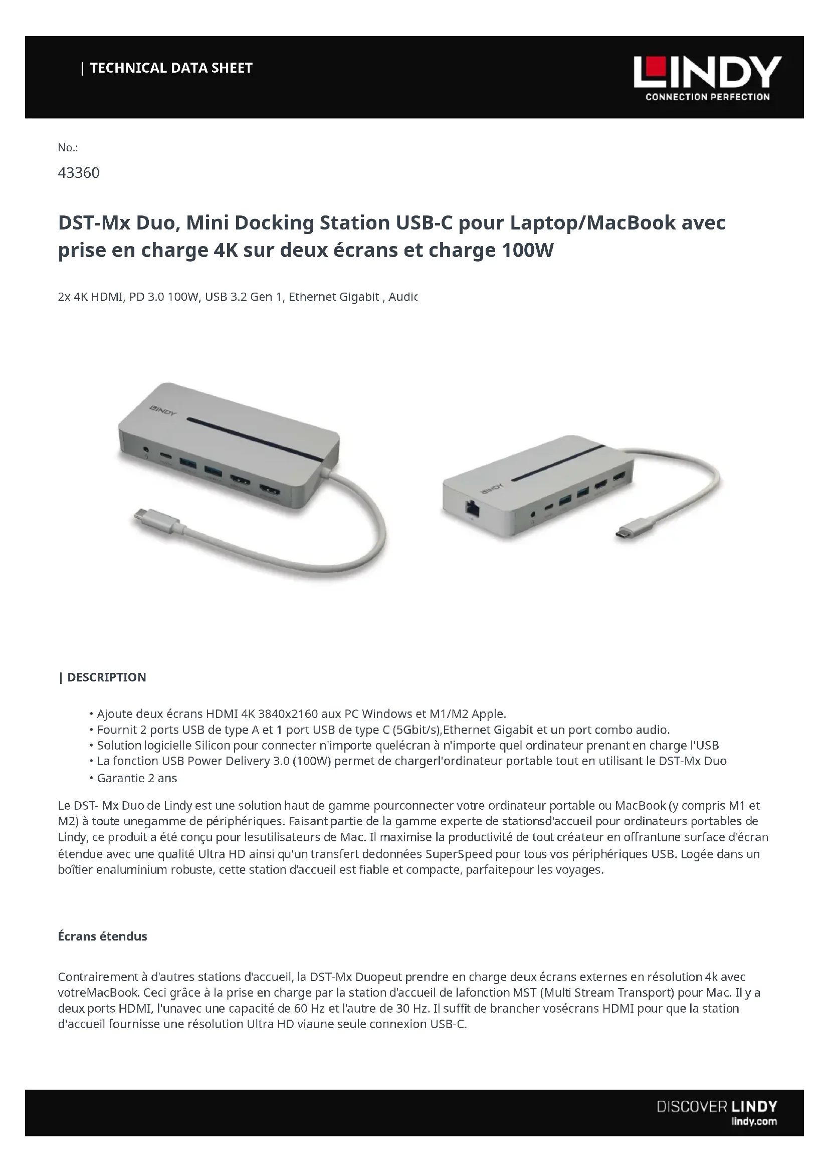 DST-Mx Duo, Mini Docking Station USB-C pour Laptop/MacBook avec prise en charge 4K sur deux écrans et charge 100W 2x 4K HDMI, PD 3.0 100W, USB 3.2 Gen 1, Ethernet Gigabit , Audio Ajoute deux écrans HDMI 4K 3840x2160 aux PC Windows et M1/M2 Apple. Fournit 2 ports USB de type A et 1 port USB de type C (5Gbit/s),Ethernet Gigabit et un port combo audio. Solution logicielle Silicon pour connecter n'importe quelécran à n'importe quel ordinateur prenant en charge l'USB La fonction USB Power Delivery 3.0 (100W) permet de chargerl'ordinateur portable tout en utilisant le DST-Mx Duo Garantie 2 ans Le DST- Mx Duo de Lindy est une solution haut de gamme pourconnecter votre ordinateur portable ou MacBook (y compris M1 et M2) à toute unegamme de périphériques. Faisant partie de la gamme experte de stationsd'accueil pour ordinateurs portables de Lindy, ce produit a été conçu pour lesutilisateurs de Mac. Il maximise la productivité de tout créateur en offrantune surface d'écran étendue avec une qualité Ultra HD ainsi qu'un transfert dedonnées SuperSpeed pour tous vos périphériques USB. Logée dans un boîtier enaluminium robuste, cette station d'accueil est fiable et compacte, parfaitepour les voyages. Écrans étendus Contrairement à d'autres stations d'accueil, la DST-Mx Duopeut prendre en charge deux écrans externes en résolution 4k avec votreMacBook. Ceci grâce à la prise en charge par la station d'accueil de lafonction MST (Multi Stream Transport) pour Mac. Il y a deux ports HDMI, l'unavec une capacité de 60 Hz et l'autre de 30 Hz. Il suffit de brancher vosécrans HDMI pour que la station d'accueil fournisse une résolution Ultra HD viaune seule connexion USB-C.