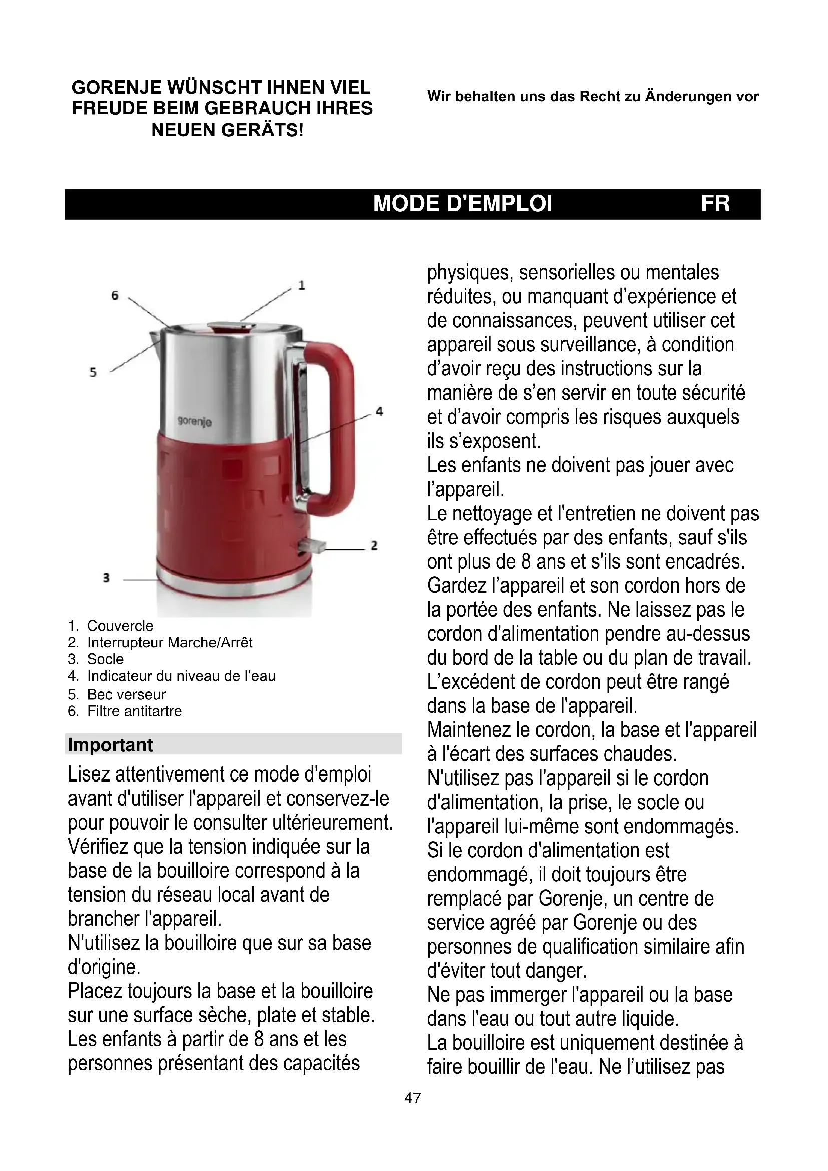 Important Lisez attentivement ce mode d'emploi avant d'utiliser l'appareil et conservez-le pour pouvoir le consulter ultérieurement. Vérifiez que la tension indiquée sur la base de la bouilloire correspond à la tension du réseau local avant de brancher l'appareil. N'utilisez la bouilloire que sur sa base d'origine. Placez toujours la base et la bouilloire sur une surface sèche, plate et stable. Les enfants à partir de 8 ans et les personnes présentant des capacités physiques, sensorielles ou mentales réduites, ou manquant d’expérience et de connaissances, peuvent utiliser cet appareil sous surveillance, à condition d’avoir reçu des instructions sur la manière de s’en servir en toute sécurité et d’avoir compris les risques auxquels ils s’exposent. Les enfants ne doivent pas jouer avec l’appareil. Le nettoyage et l'entretien ne doivent pas être effectués par des enfants, sauf s'ils ont plus de 8 ans et s'ils sont encadrés. Gardez l’appareil et son cordon hors de la portée des enfants. Ne laissez pas le cordon d'alimentation pendre au-dessus du bord de la table ou du plan de travail. L’excédent de cordon peut être rangé dans la base de l'appareil. Maintenez le cordon, la base et l'appareil à l'écart des surfaces chaudes. N'utilisez pas l'appareil si le cordon d'alimentation, la prise, le socle ou l'appareil lui-même sont endommagés. Si le cordon d'alimentation est endommagé, il doit toujours être remplacé par Gorenje, un centre de service agréé par Gorenje ou des personnes de qualification similaire afin d'éviter tout danger. Ne pas immerger l'appareil ou la base dans l'eau ou tout autre liquide. La bouilloire est uniquement destinée à faire bouillir de l'eau. Ne l’utilisez pas48 pour réchauffer de la soupe ou d’autres liquides ou des aliments en pot, en bouteille ou en conserve. L’eau bouillante peut provoquer de graves brûlures. Soyez prudent lorsque la bouilloire contient de l’eau chaude. Ne remplissez jamais la bouilloire au- delà de l’indication du niveau maximum. Si la bouilloire a été trop remplie, de l'eau bouillante peut être éjectée par le bec verseur et provoquer des brûlures. N'ouvrez pas le couvercle pendant que l'eau est en train de bouillir. Faites attention lorsque vous ouvrez le couvercle immédiatement après que l'eau a bouilli : la vapeur qui sort de la bouilloire est très chaude. Évitez de toucher le corps de la bouilloire, car il devient très chaud pendant l’utilisation. Soulevez toujours la bouilloire par sa poignée. Veillez toujours à ce que l'eau contenue dans la bouilloire couvre au moins le fond de celle-ci pour éviter que la bouilloire ne bout à sec. De la condensation peut apparaître sur la base de la bouilloire. Ceci est parfaitement normal et ne signifie pas que la bouilloire présente des défauts. Selon la dureté de l’eau dans votre région, de petites taches peuvent apparaître sur l’élément chauffant de votre bouilloire lorsque vous l’utilisez. Ce phénomène est le résultat de l'accumulation de tartre sur l'élément chauffant et à l'intérieur de la bouilloire au fil du temps. Plus l'eau est dure, plus le tartre s'accumule rapidement. Le tartre peut se présenter sous différentes couleurs. Bien que le tartre ne présente aucun danger, un excès de tartre peut nuire aux performances de votre bouilloire. Détartrez régulièrement votre bouilloire en suivant les instructions indiquées dans le chapitre « Détartrage ». Champs électromagnétiques (CEM) Cet appareil Gorenje est conforme à toutes les normes concernant les champs électromagnétiques (CEM). S'il est manipulé correctement et conformément aux instructions de ce manuel d'utilisation, l'appareil est sûr à utiliser selon les preuves scientifiques disponibles aujourd'hui. Cet appareil est marqué conformément à la directive européenne 2012/19/UE relative aux déchets d'équipements électriques et électroniques (DEEE). Cette directive est le cadre d'une validité à l'échelle européenne de la reprise et du recyclage des déchets d'équipements électriques et électroniques. Protection contre l'ébullition à sec Cette bouilloire est équipée d’une protection contre l'ébullition à sec. Ce dispositif éteint automatiquement la bouilloire si elle est accidentellement mise en marche alors qu'il n'y a pas d'eau ou pas assez d'eau à l'intérieur. L'interrupteur marche/arrêt reste en position « marche », mais l'anneau lumineux de mise sous tension s'éteint. Mettez l'interrupteur marche/arrêt sur « arrêt » et laissez la bouilloire refroidir pendant 10 minutes. Soulevez ensuite la bouilloire de son socle pour réinitialiser la protection contre l'ébullition à sec. La bouilloire est à nouveau prête à l'emploi. Avant la première utilisation