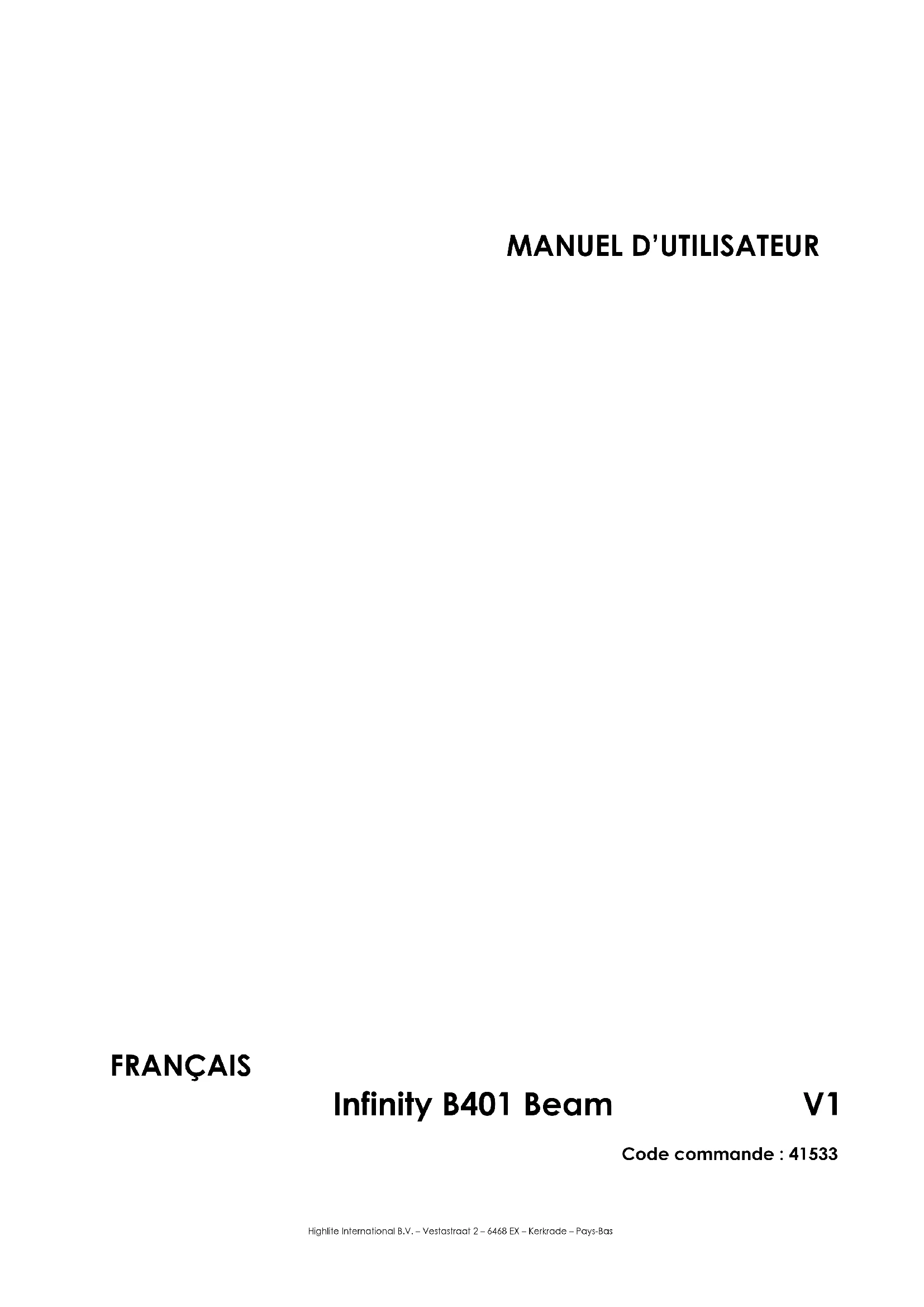 Site web : www.highlite.com Adresse électronique : service@highlite.com61 Code commande : 41533 Infinity B401 Beam Certification L’Infinity B401 Beam est conforme aux directives et aux normes suivantes : ● Directive 2011/65/11 relative à la limitation de l’utilisation de certaines substances dangereuses ● Directive 2014/53/UE relative à la mise à disposition sur le marché d'équipements radioélectriques ● Sécurité de l’équipement électrique ● Exposition des humains à des champs électromagnétiques ● Compatibilité électromagnétique ● Substances limitées dans les produits électriques La déclaration de conformité complète se trouve sur www.highlite.com.
