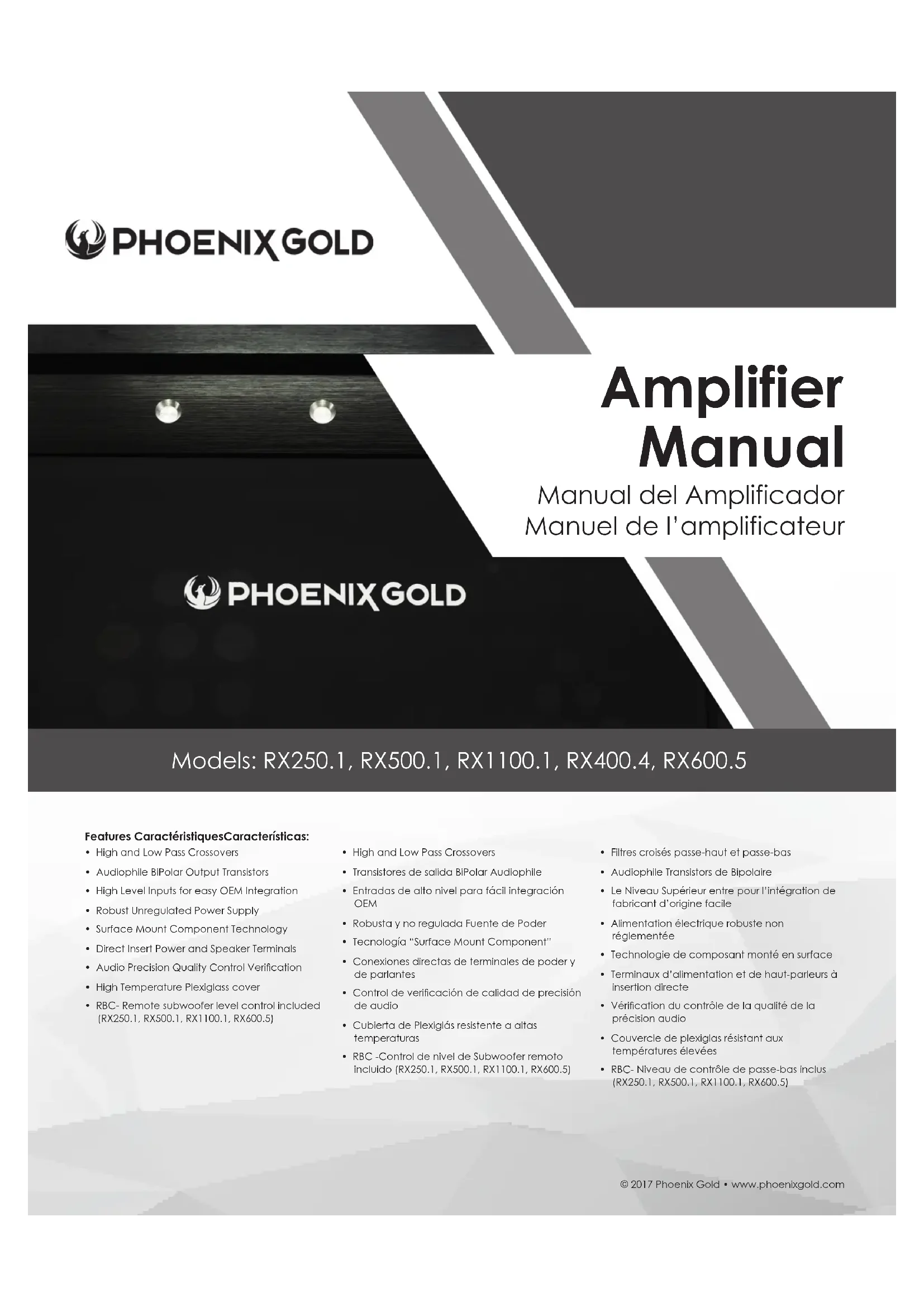 Doit être relié à la borne +12 V commutée, généralement un l d’amorçage sortant de l’unité principale ou de l’allumage. MASSE Doit être relié à la borne négative de la batterie de la voiture ou boulonné sur un élément propre et non peint du châssis du véhicule. ENTRÉE DE L’AFFICHAGE DE TENSION A DISTANCE (RMD) Connectez le RMD d’afchage de tension facultatif à cette prise jack. SORTIES HAUT-PARLEUR Sert à relier l’amplicateur aux haut-parleurs. RX250.1/RX500.1 l’impédance minimale est de 2 ohm. RX1100.1 l’impédance minimale est de 1 ohm.© 2017 Phoenix Gold • www.phoenixgold.com Amplifier Owner’s Manual ENTRÉE Reliez les câbles de signal préampli de l’unité principale sur ces bornes. FRÉQUENCE DE FILTRE PASSIF PASSE-BAS et PASSE-HAUT Contrôle les points de ltre pour les sorties du haut- parleur. +12V Doit être relié à la borne positive protégée par fusible (+12 V) de la batterie de la voiture. Le fusible doit être situé à moins de 18 pouces de la batterie.