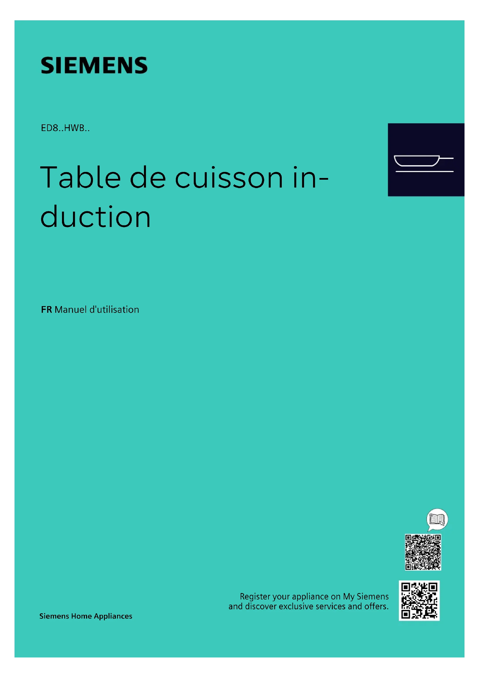 - Table de cuisson in- duction FR Manuel d'utilisation Siemens Home Appliances Register your appliance on My Siemens and discover exclusive services and offers.fr Table des matières Vous pouvez trouver d'autres informations et explications en ligne. Scannez le code QR sur la page de titre. Table des matièresTable des matières 1 Sécurité p. 2