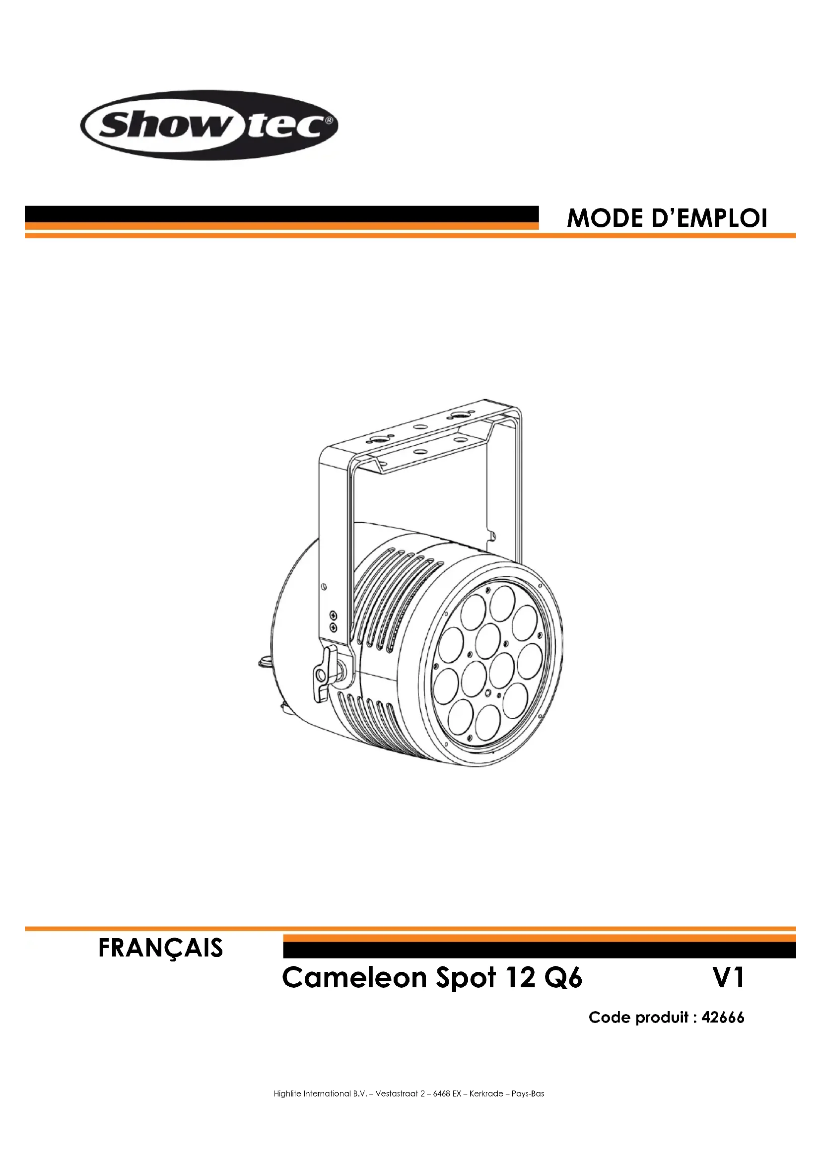 Cameleon Spot 12 Q6 Code produit : 42666 Préface Nous vous remercions d’avoir fait l’acquisition de ce produit Showtec. L’objectif de ce mode d’emploi est de vous fournir des instructions pour une utilisation correcte et sûre de ce produit. Conservez le mode d’emploi pour pouvoir le consulter ultérieurement, car il fait partie intégrante du produit. Le mode d’emploi doit être conservé dans un endroit facilement accessible. Ce mode d’emploi contient des informations concernant : ● Consignes de sécurité ● Installation et fonctionnement de l’appareil ● Utilisations conformes et non conformes de l’appareil ● Procédures d’entretien ● Dépannage ● Transport, stockage et élimination de l’appareil Le non-respect des instructions contenues dans ce mode d’emploi peut entraîner des blessures graves et des dommages matériels.