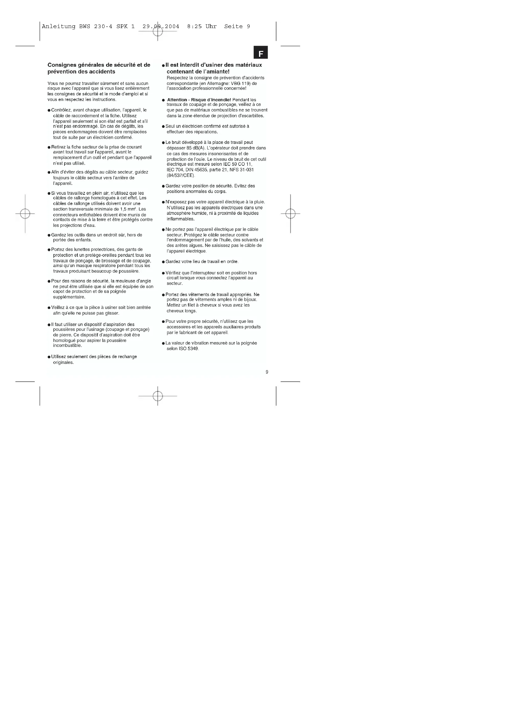Clamping flange Flange nut Flange arrangement when using a straight cutting wheel Anleitung BWS 230-4 SPK 1 29.09.2004 8:25 Uhr Seite 89 Consignes générales de sécurité et de prévention des accidents Vous ne pourrez travailler sûrement et sans aucun risque avec l’appareil que si vous lisez entièrement les consignes de sécurité et le mode d’emploi et si vous en respectez les instructions. Contrôlez, avant chaque utilisation, l’appareil, le câble de raccordement et la fiche. Utilisez l’appareil seulement si son état est parfait et s’il n’est pas endommagé. En cas de dégâts, les pièces endommagées doivent être remplacées tout de suite par un électricien confirmé. Retirez la fiche secteur de la prise de courant avant tout travail sur l’appareil, avant le remplacement d’un outil et pendant que l’appareil n’est pas utilisé. Afin d’éviter des dégâts au câble secteur, guidez toujours le câble secteur vers l’arrière de l’appareil. Si vous travaillez en plein air, n’utilisez que les câbles de rallonge homologués à cet effet. Les câbles de rallonge utilisés doivent avoir une section transversale minimale de 1,5 mm
