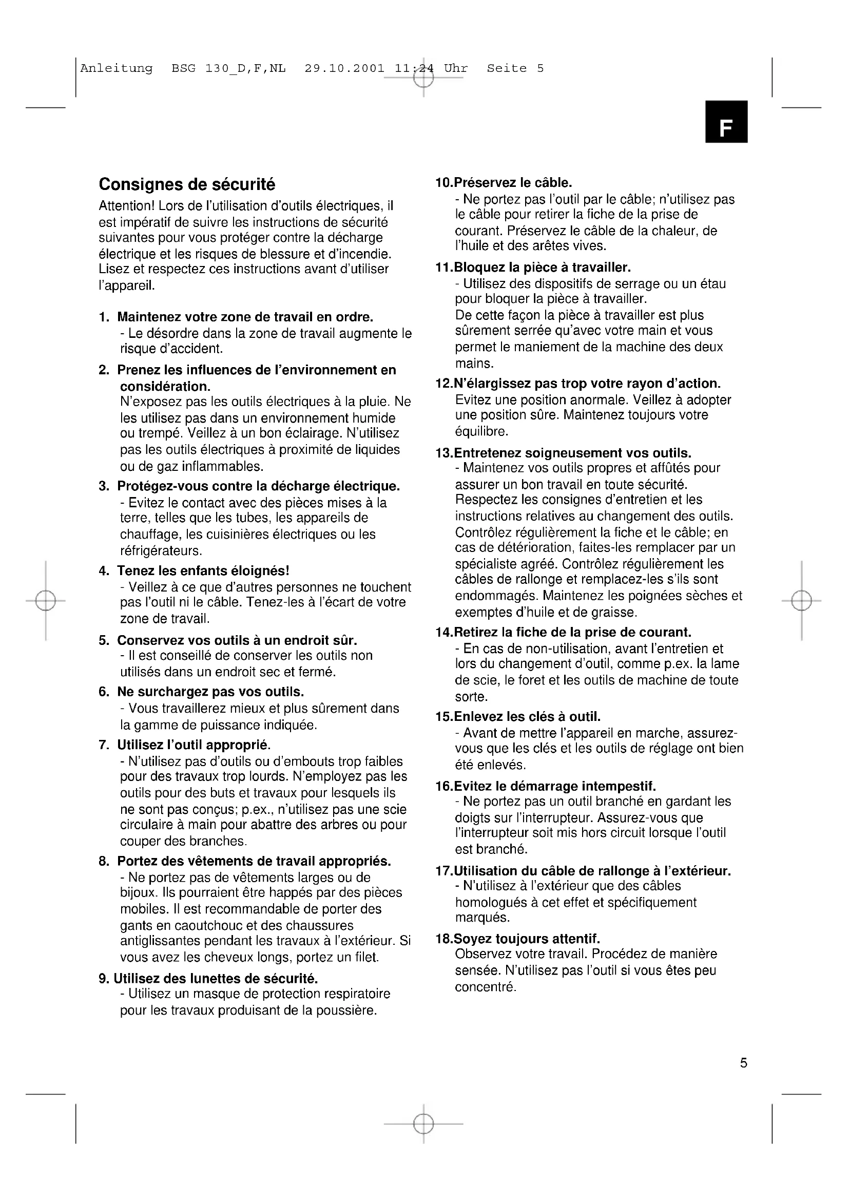 - Utilisez un masque de protection respiratoire pour les travaux produisant de la poussière. 10.Préservez le câble. - Ne portez pas l’outil par le câble; n’utilisez pas le câble pour retirer la fiche de la prise de courant. Préservez le câble de la chaleur, de l’huile et des arêtes vives. 11.Bloquez la pièce à travailler. - Utilisez des dispositifs de serrage ou un étau pour bloquer la pièce à travailler. De cette façon la pièce à travailler est plus sûrement serrée qu’avec votre main et vous permet le maniement de la machine des deux mains. 12.N’élargissez pas trop votre rayon d’action. Evitez une position anormale. Veillez à adopter une position sûre. Maintenez toujours votre équilibre. 13.Entretenez soigneusement vos outils. - Maintenez vos outils propres et affûtés pour assurer un bon travail en toute sécurité. Respectez les consignes d’entretien et les instructions relatives au changement des outils. Contrôlez régulièrement la fiche et le câble; en cas de détérioration, faites-les remplacer par un spécialiste agréé. Contrôlez régulièrement les câbles de rallonge et remplacez-les s’ils sont endommagés. Maintenez les poignées sèches et exemptes d’huile et de graisse. 14.Retirez la fiche de la prise de courant. - En cas de non-utilisation, avant l’entretien et lors du changement d’outil, comme p.ex. la lame de scie, le foret et les outils de machine de toute sorte. 15.Enlevez les clés à outil. - Avant de mettre l’appareil en marche, assurez- vous que les clés et les outils de réglage ont bien été enlevés. 16.Evitez le démarrage intempestif. - Ne portez pas un outil branché en gardant les doigts sur l’interrupteur. Assurez-vous que l’interrupteur soit mis hors circuit lorsque l’outil est branché. 17.Utilisation du câble de rallonge à l’extérieur. - N’utilisez à l’extérieur que des câbles homologués à cet effet et spécifiquement marqués. 18.Soyez toujours attentif. Observez votre travail. Procédez de manière sensée. N’utilisez pas l’outil si vous êtes peu concentré. Anleitung BSG 130_D,F,NL 29.10.2001 11:24 Uhr Seite 56