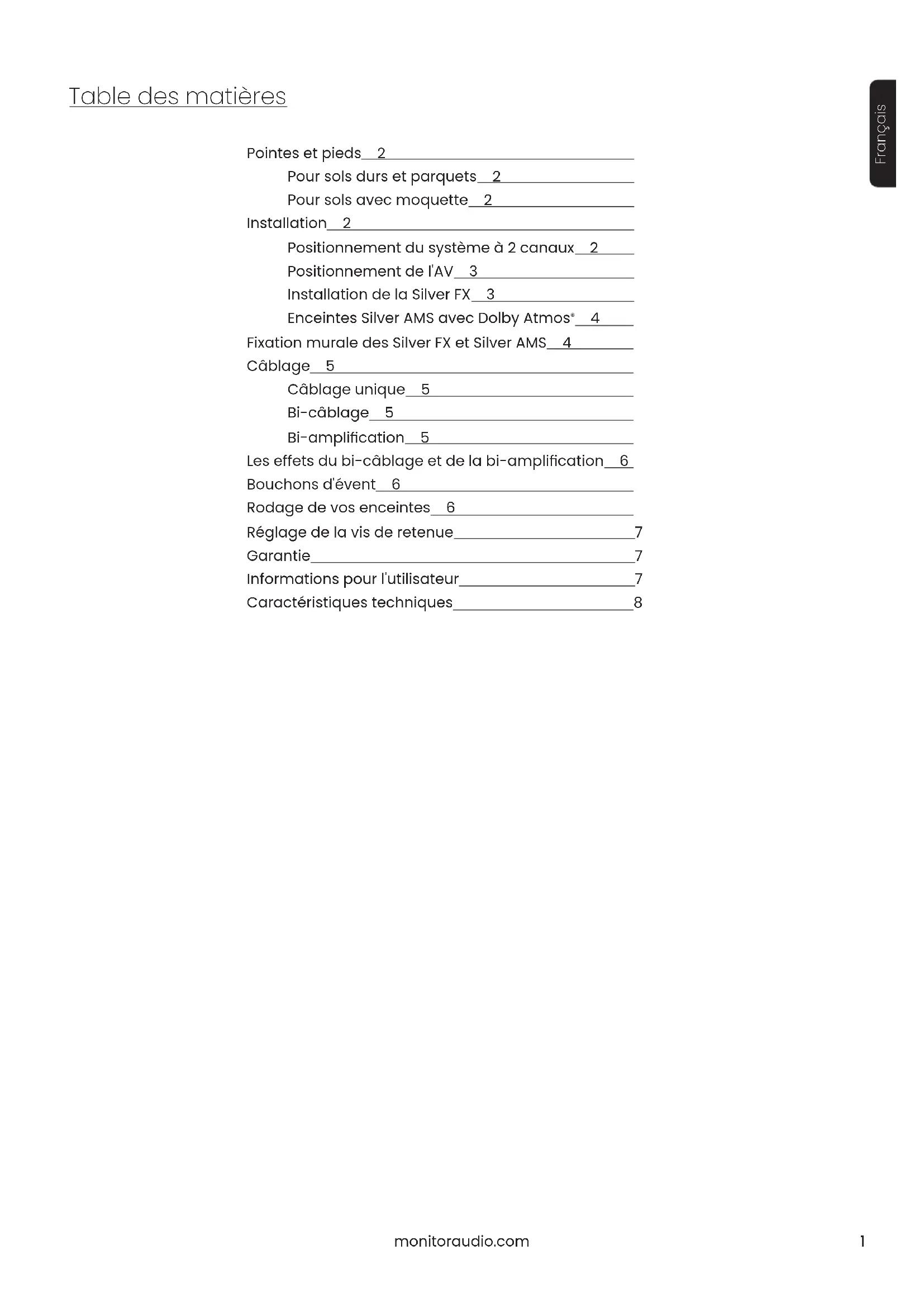 Mode d'emploiTable des matières Pointes et pieds 2 Pour sols durs et parquets 2 Pour sols avec moquette 2 Installation 2 Positionnement du système à 2 canaux 2 Positionnement de l'AV 3 Installation de la Silver FX 3 Enceintes Silver AMS avec Dolby Atmos