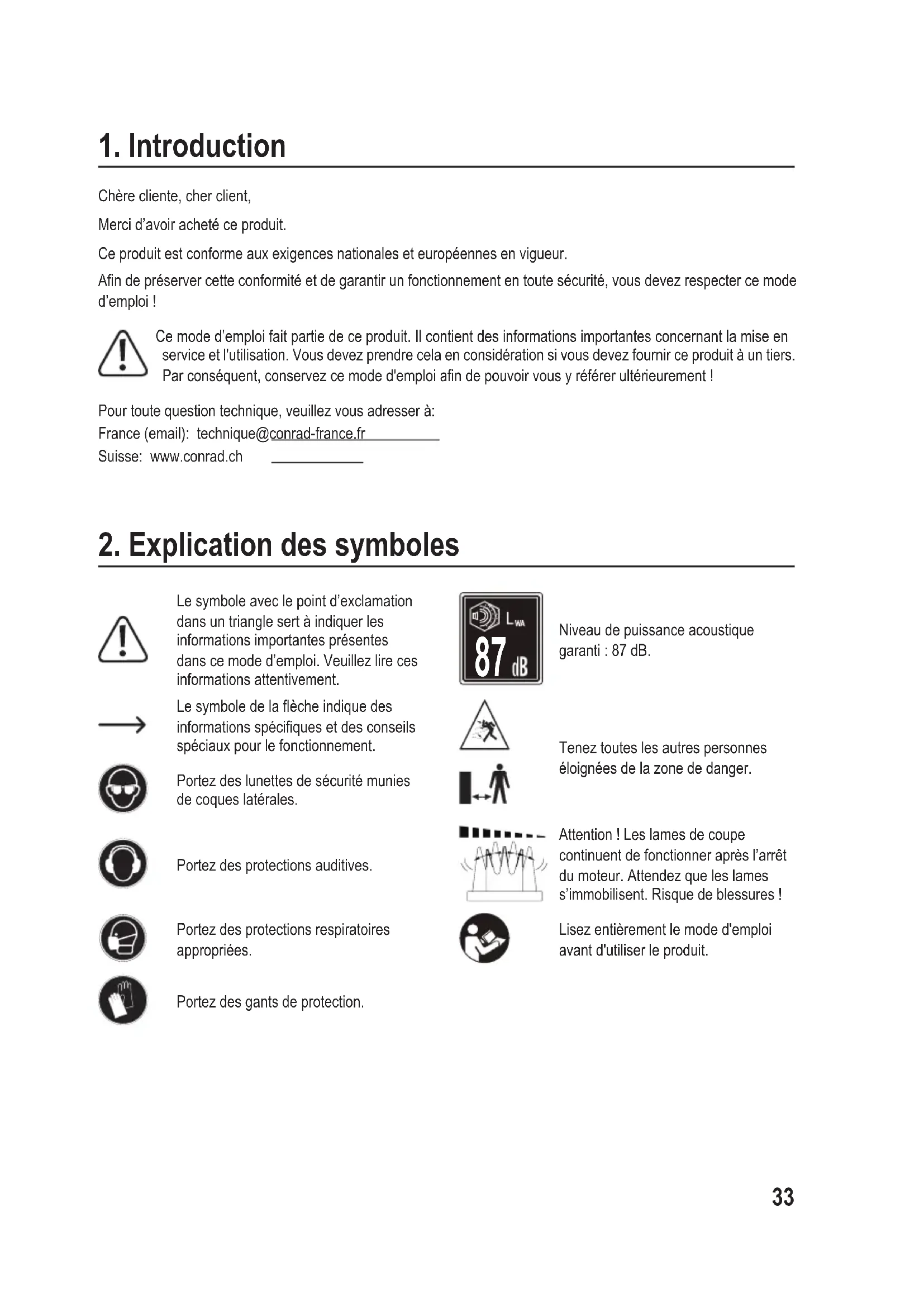 Niveau de puissance acoustique garanti : 87 dB. Le symbole de la èche indique des informations spéciques et des conseils spéciaux pour le fonctionnement. Tenez toutes les autres personnes éloignées de la zone de danger.